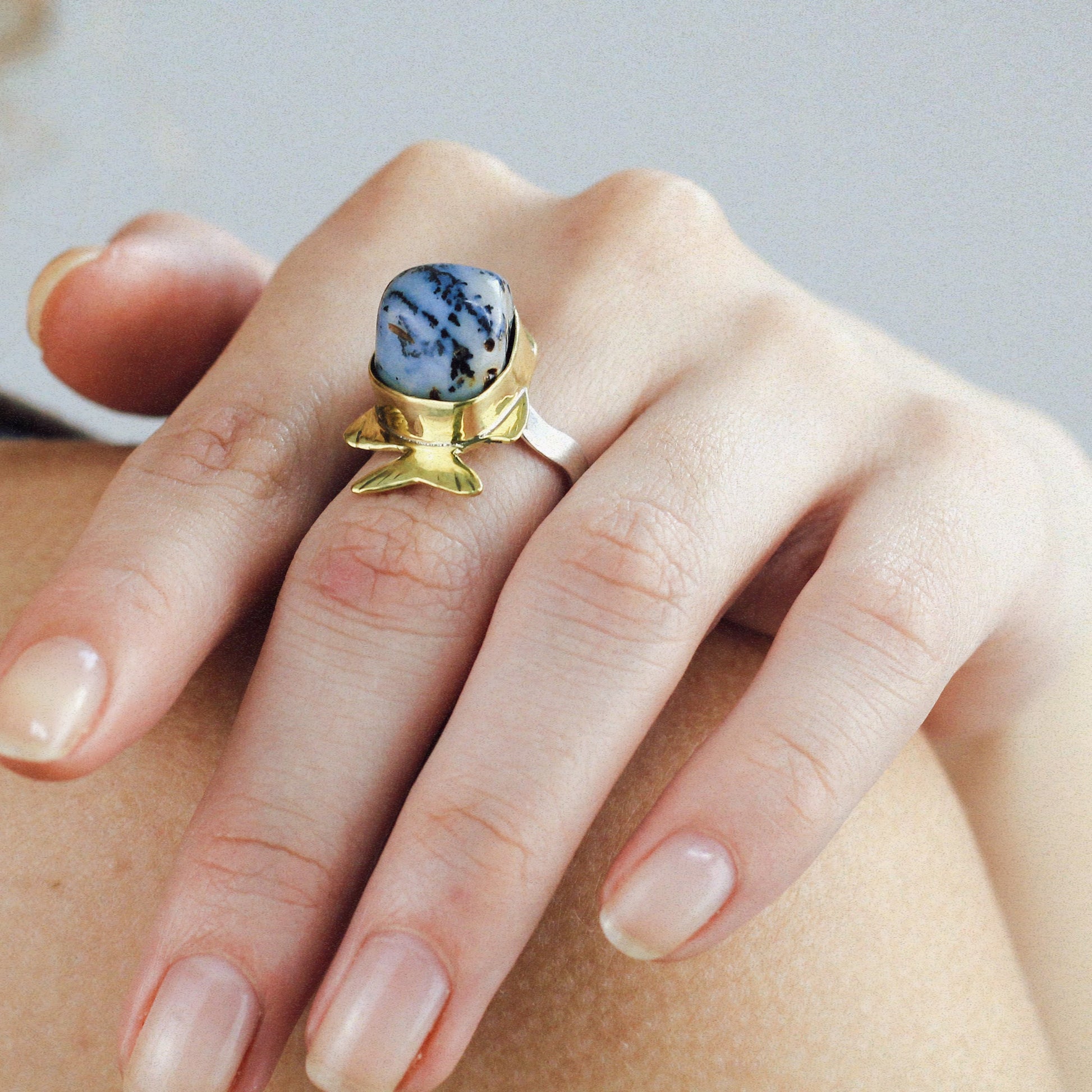 O Anel regulável feito em pata e peixe feito em latão medindo 1,5cm x 2,0 cm, com acabamento polido e uma pedra Dendrita. Ele serve em dedos de 14 a 20.