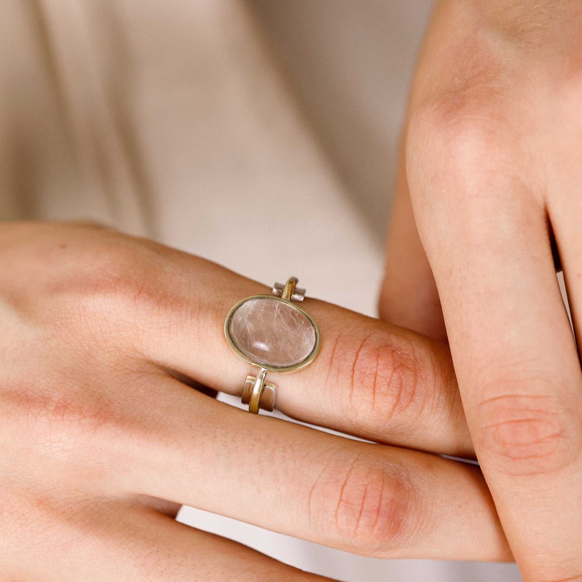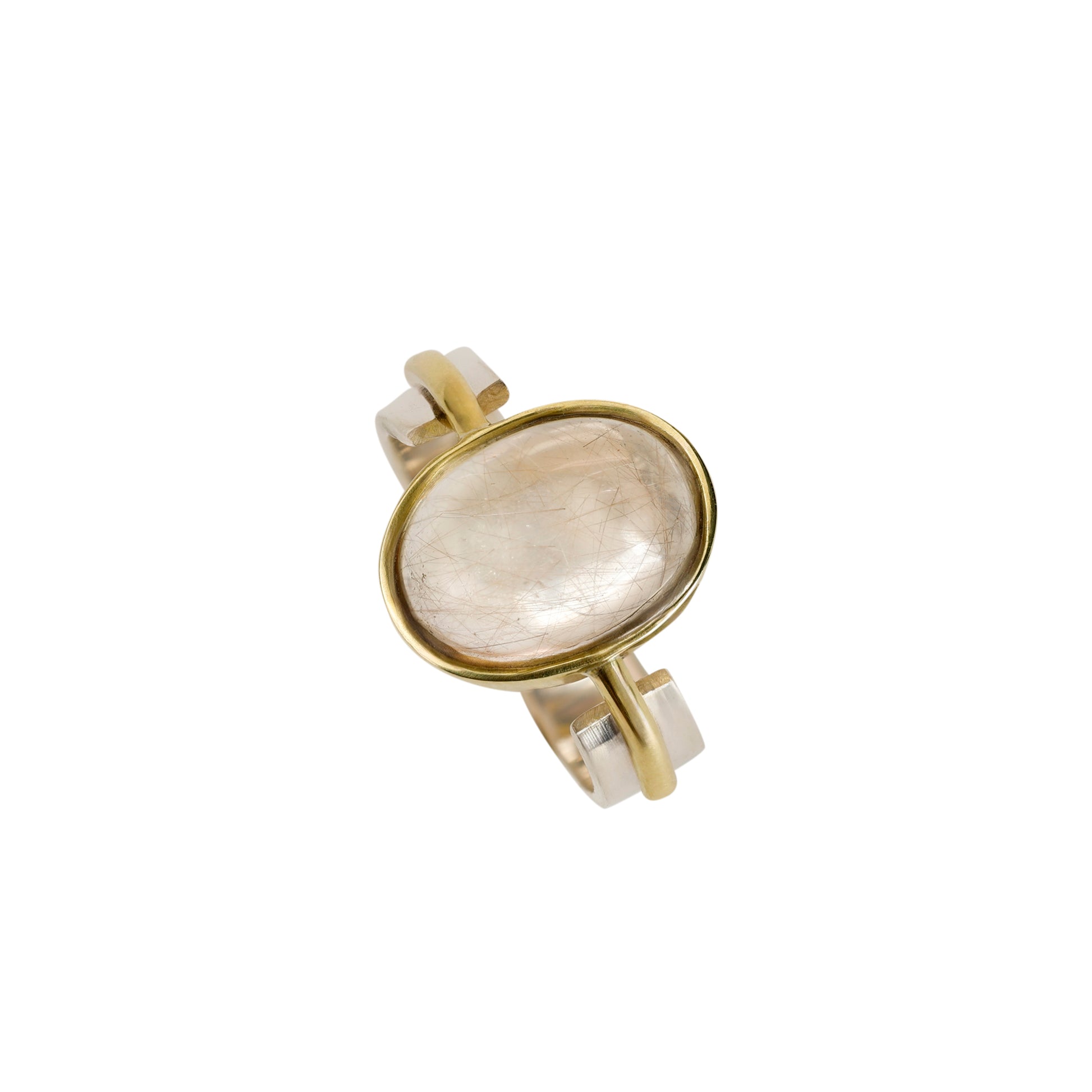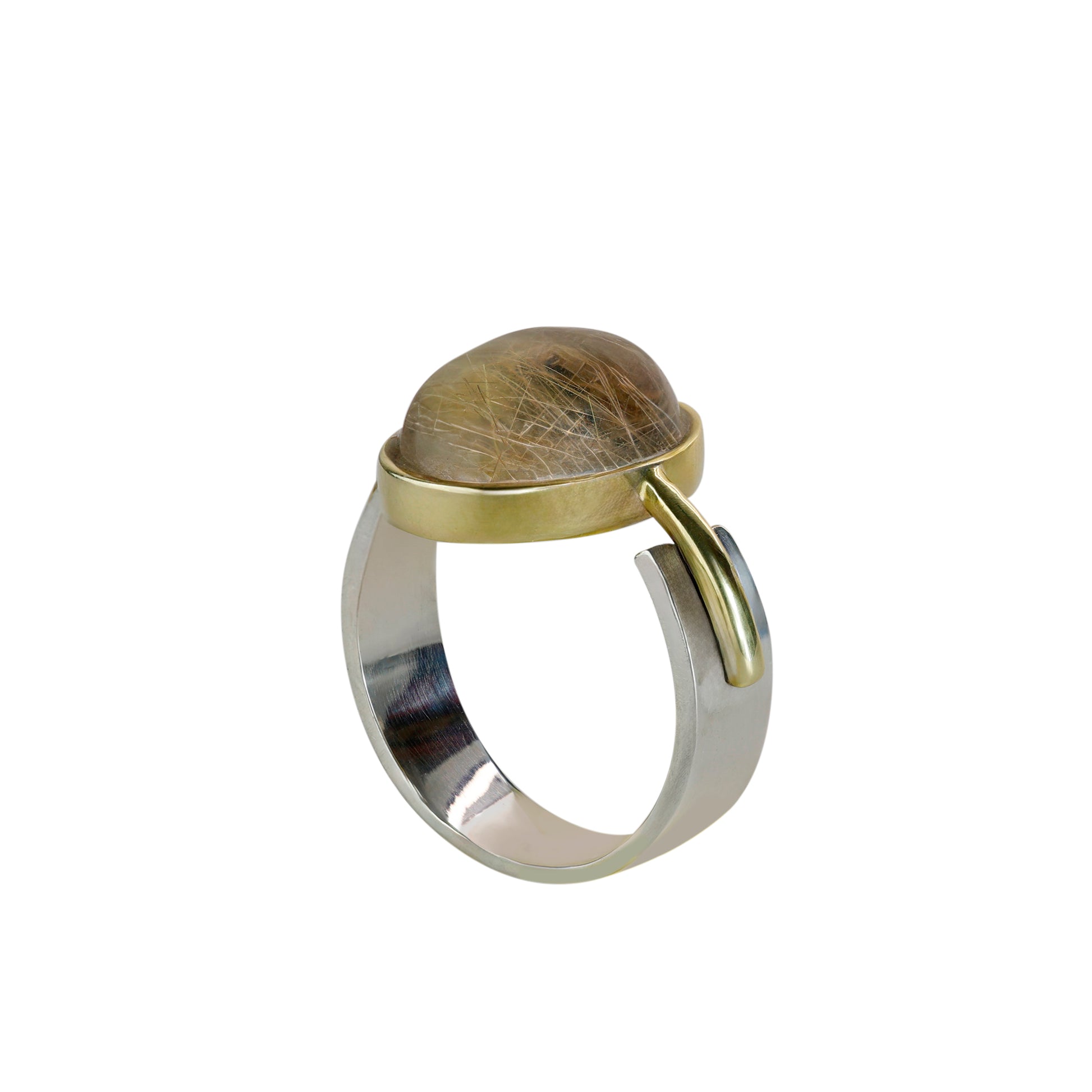 Anel de prata que sustenta um quartzo rutilado envolvido por latão. Acabamento Polido, sem banho e sem verniz.