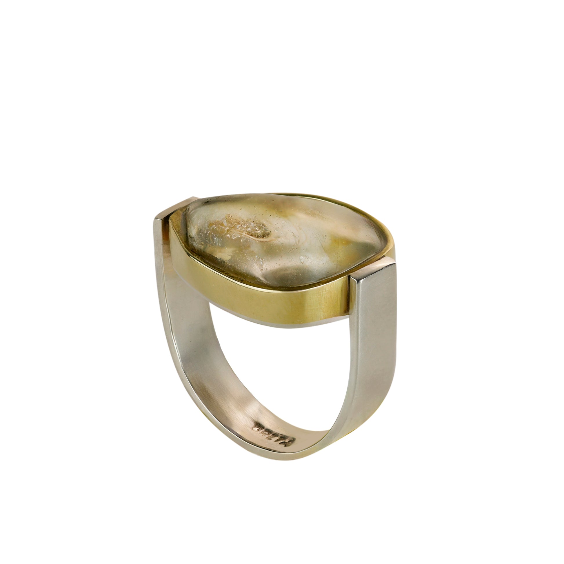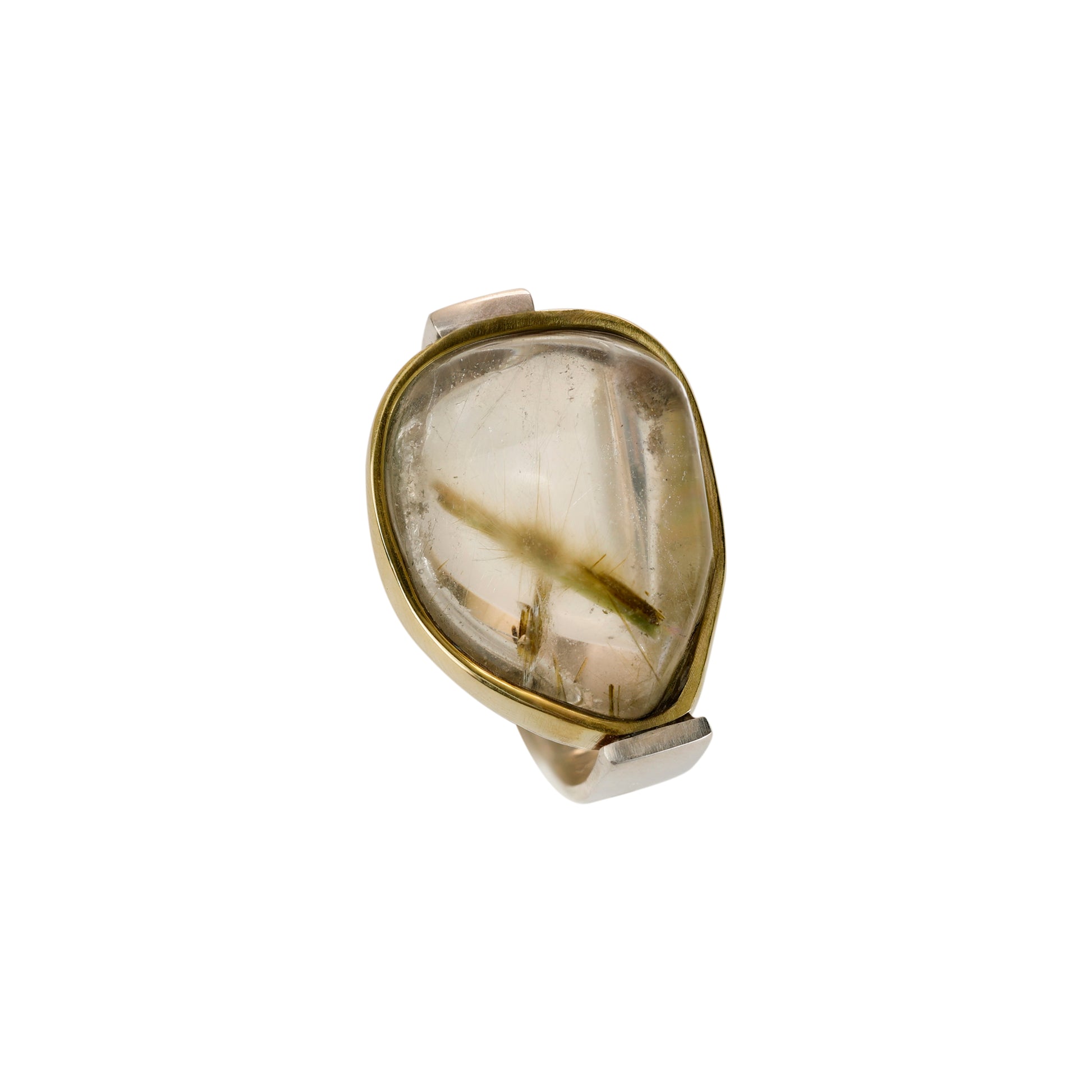 Anel de prata que sustenta um quartzo rutilado envolvido por latão. Acabamento Polido, sem banho e sem verniz.