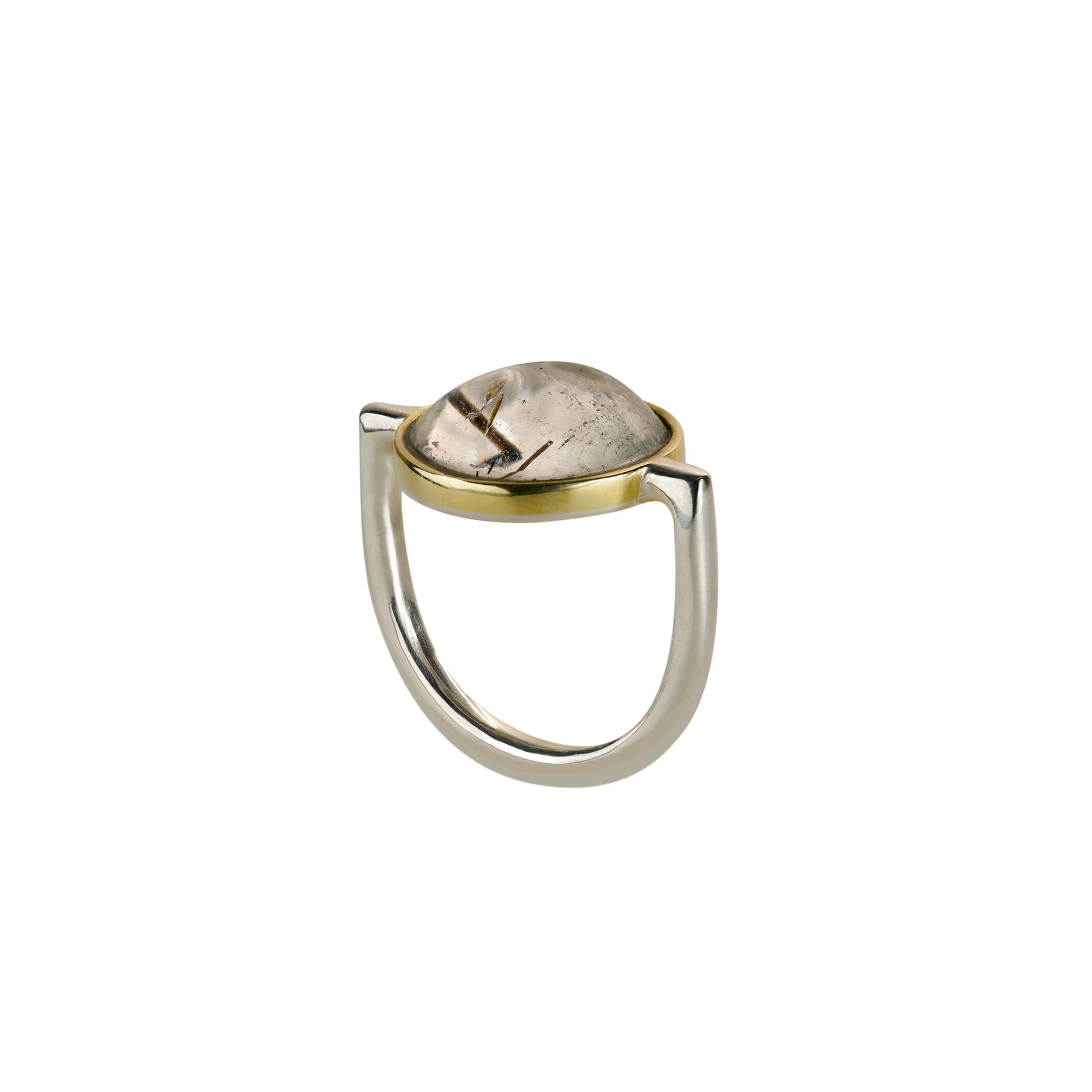 Anel de prata que susteta um quartzo rutilado envolvido por latão. Acabamento Polido, sem banho e sem verniz.