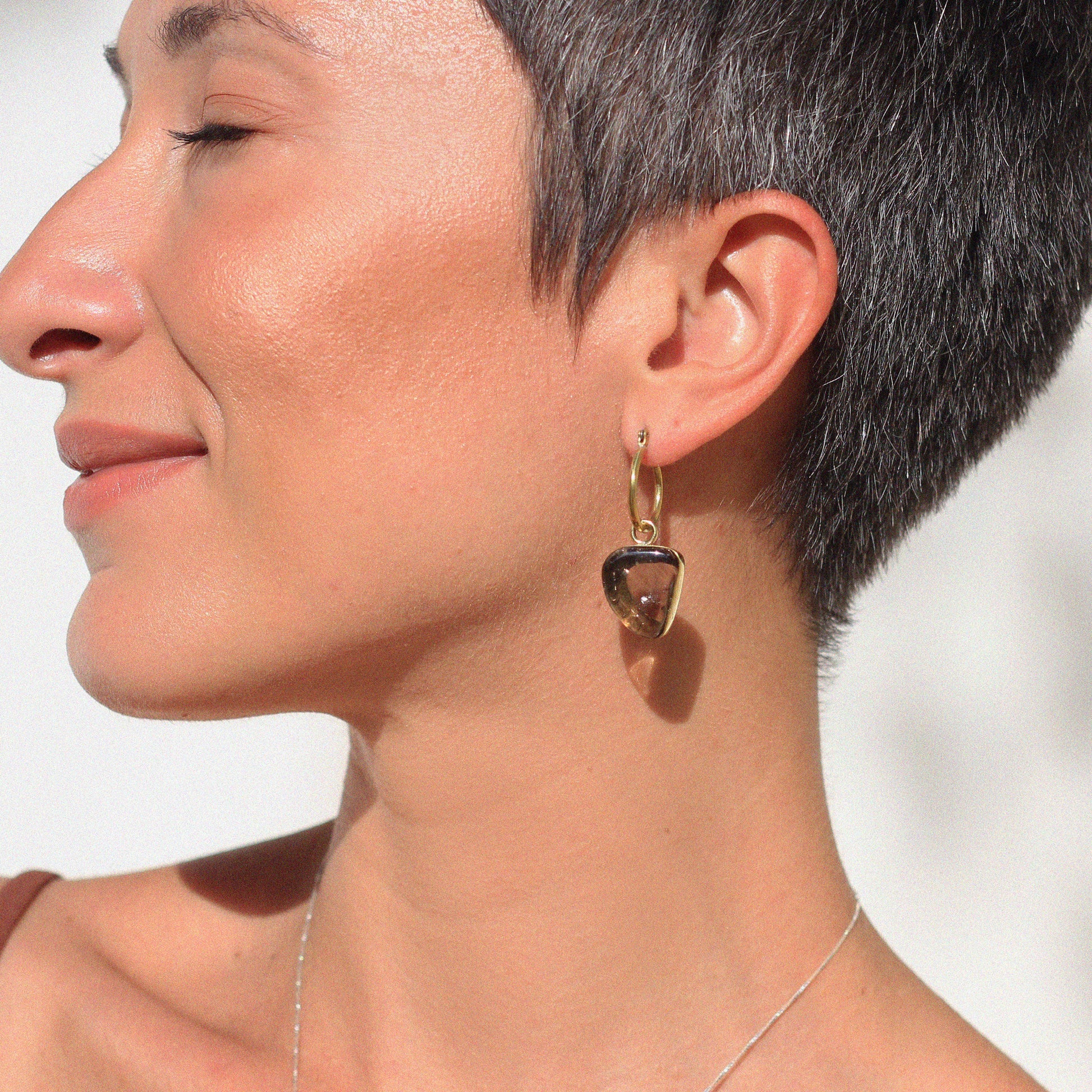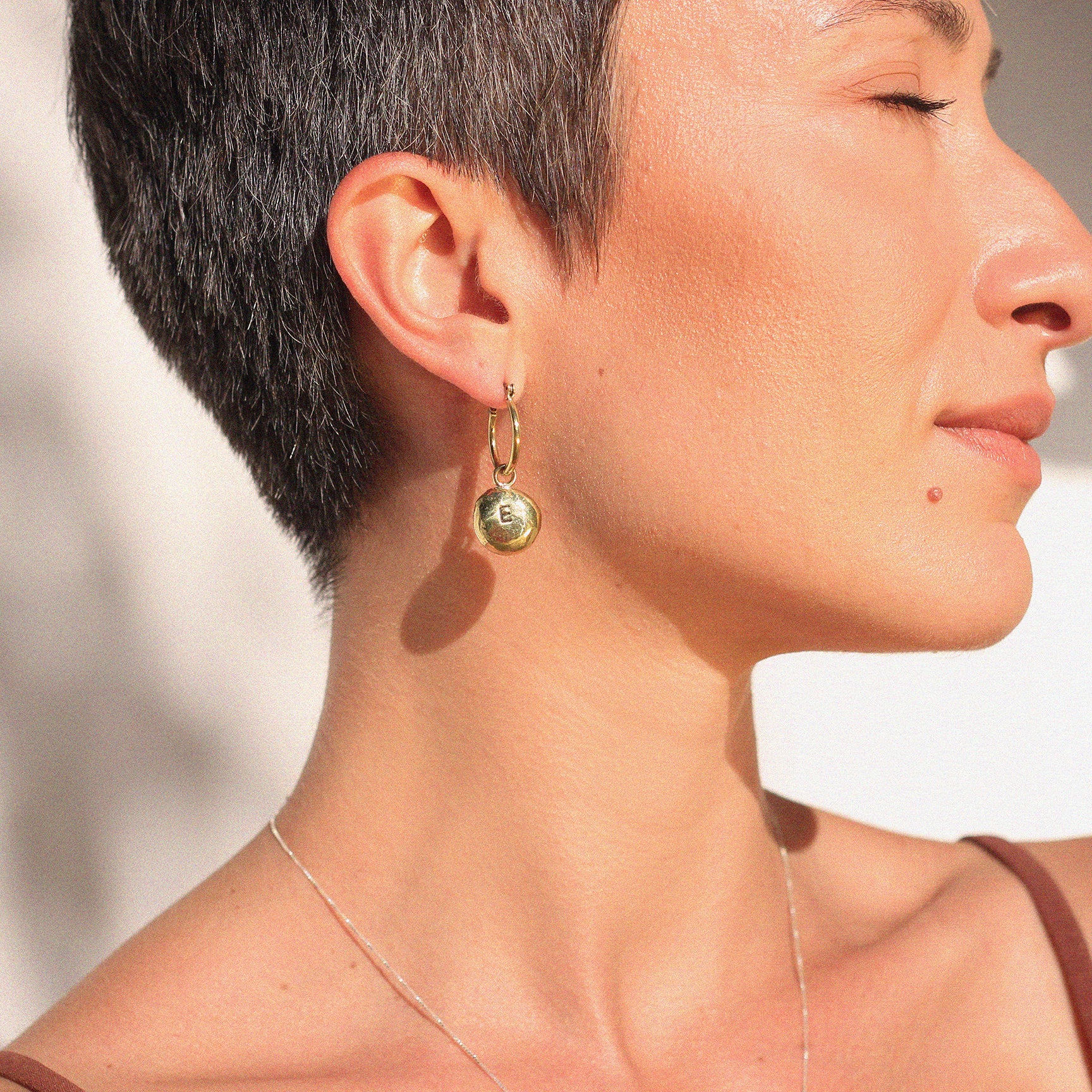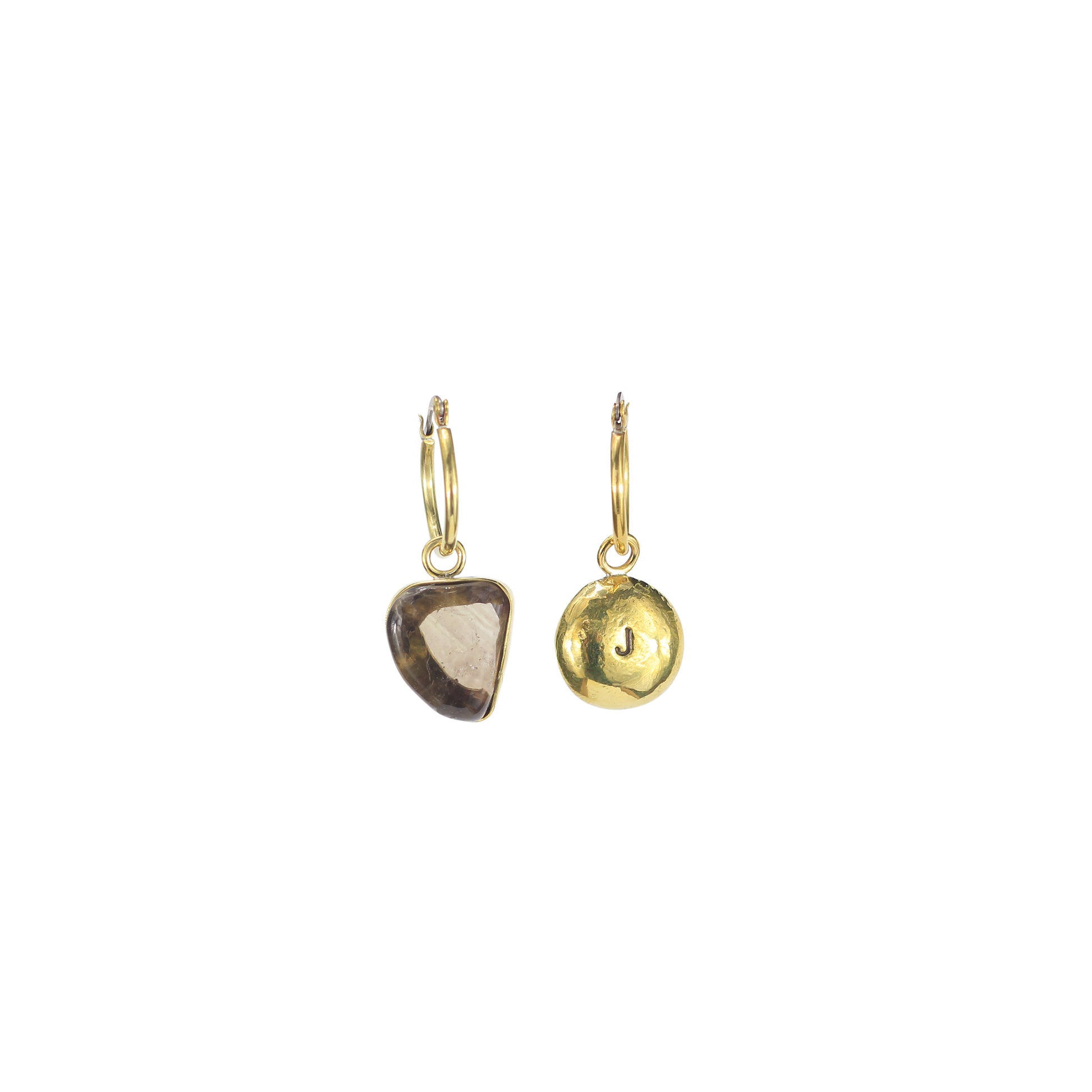 O brinco é composto por um par de argolas fechadas, produzidas em latão com pino de aço. Os pingentes são uma pepita de latão derretido, que você pode personalizar com uma letra, e do outro lado uma pedra natural rolada Green Gold. Você pode usar as argolas com ou sem os pingentes.