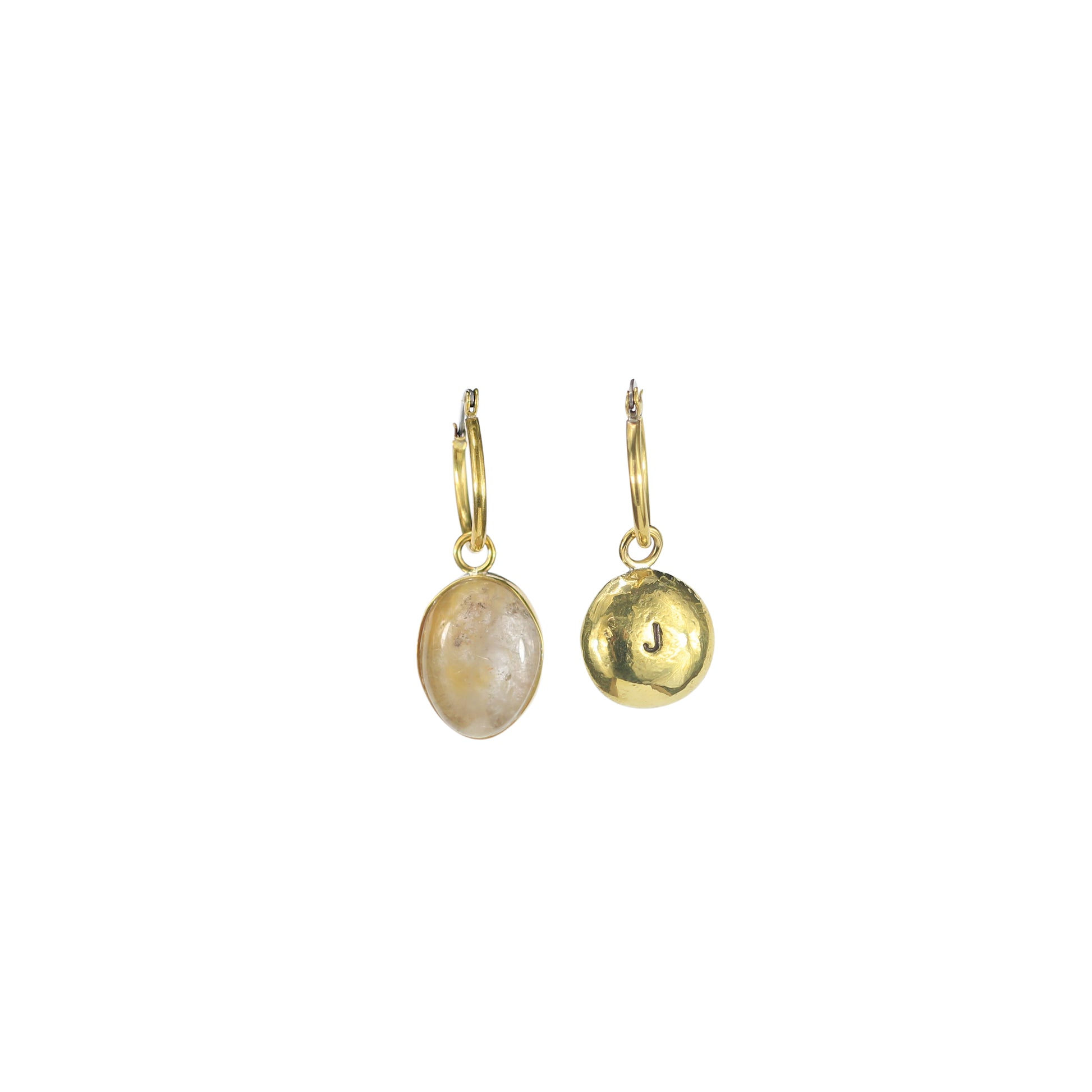 O brinco é composto por um par de argolas fechadas, produzidas em latão com pino de aço. Os pingentes são uma pepita de latão derretido, que você pode personalizar com uma letra, e do outro lado uma pedra natural rolada Quartzo Rutilado. Você pode usar as argolas com ou sem os pingentes.
