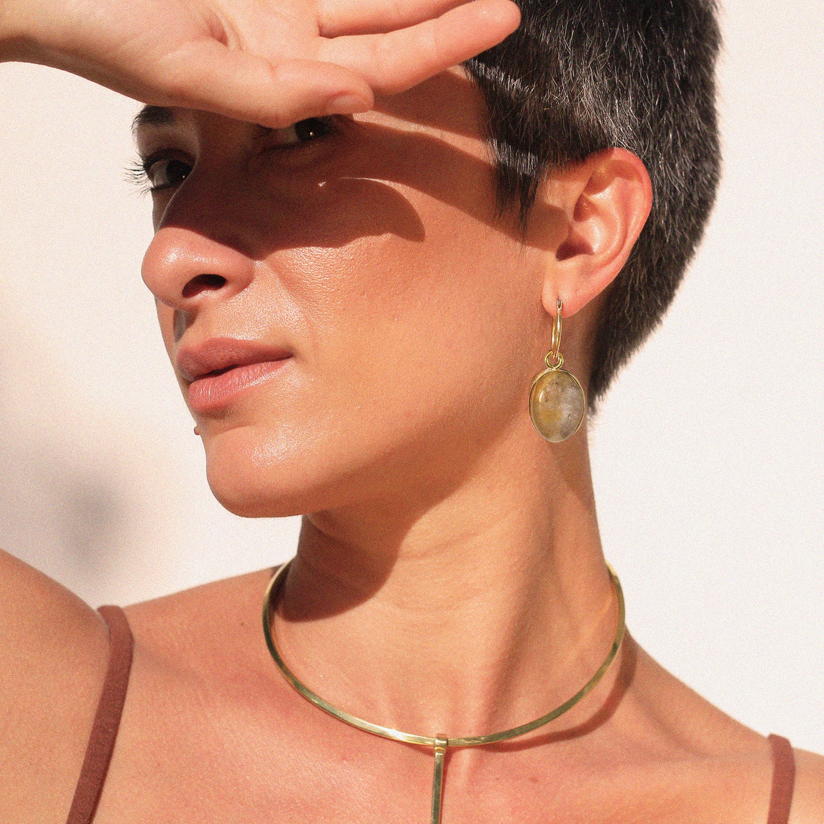 Brinco Argola de Latão com Quartzo Rutilado e Pepita de Latão