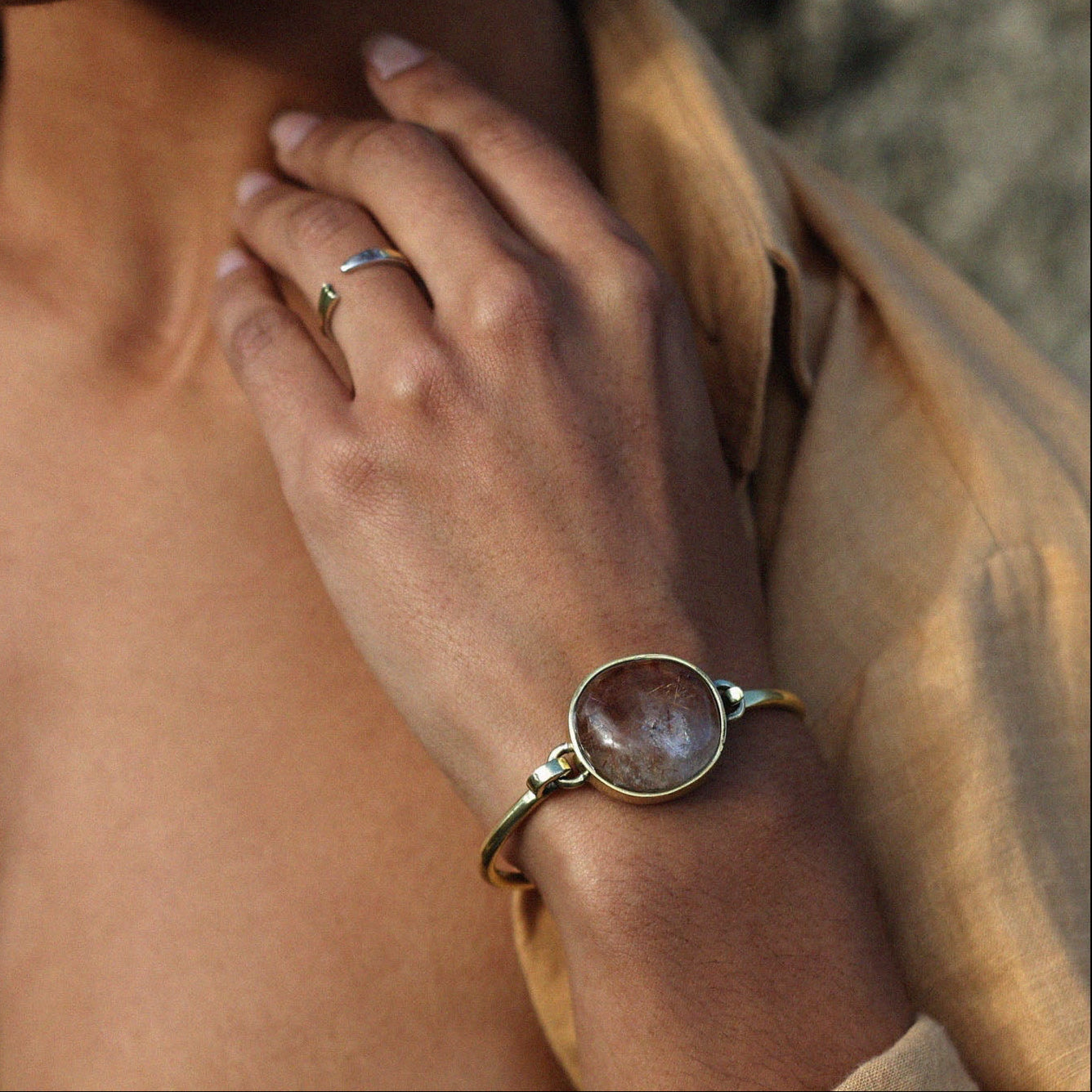 Bracelete feito de latão bruto polido com Quartzo Rutilado.