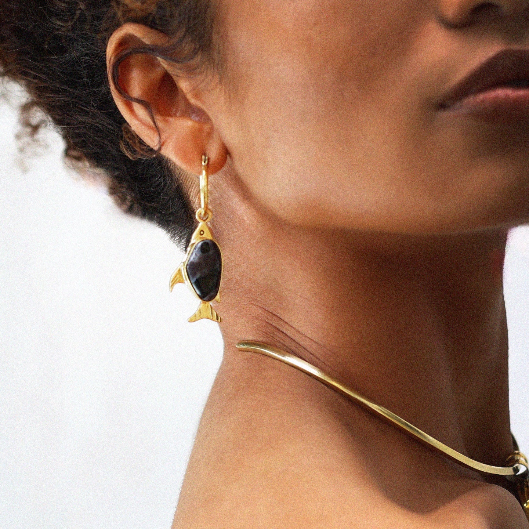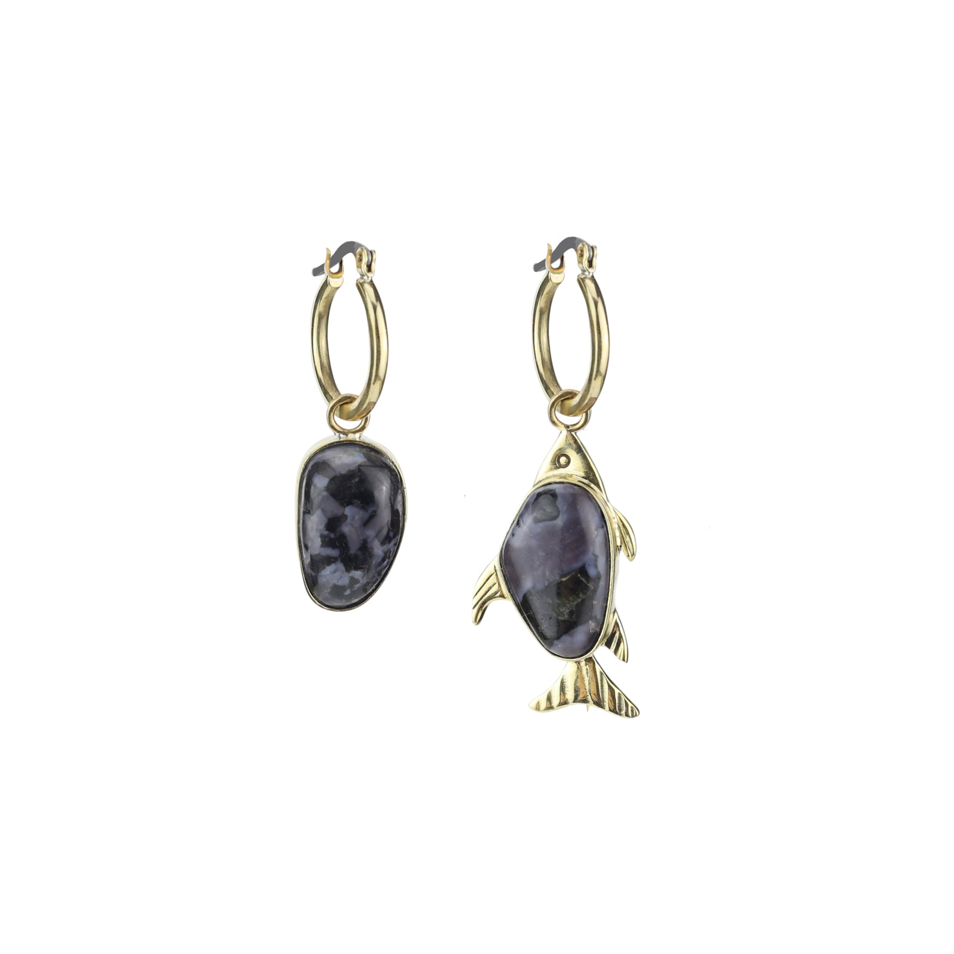 O brinco é composto por um par de argolas fechadas, produzidas em latão com pino de aço. Pingentes com pedra natural quartzo azul, pingente de peixe esculpido a partir do desenho da pedra. Acabamento Polido, sem banho e sem verniz. Você pode usar as argolas com ou sem os pingentes.