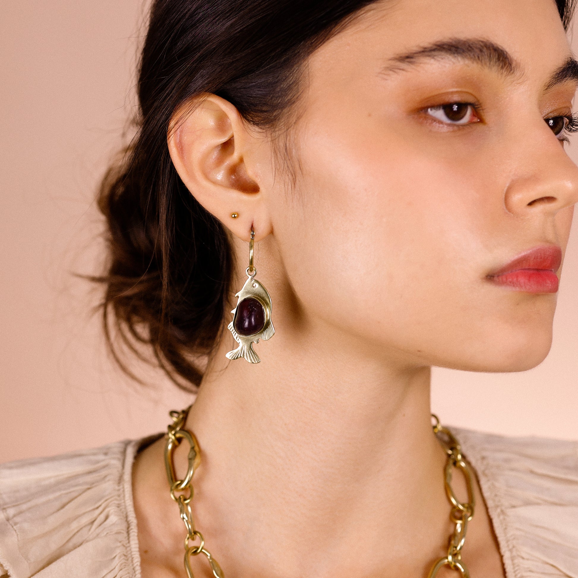 O brinco é composto por um par de argolas fechadas, produzidas em latão com pino de aço. Pingentes com pedra natural Jaspe Moukaita, pingente de peixe esculpido a partir do desenho da pedra. Acabamento Polido, sem banho e sem verniz. Você pode usar as argolas com ou sem os pingentes.
