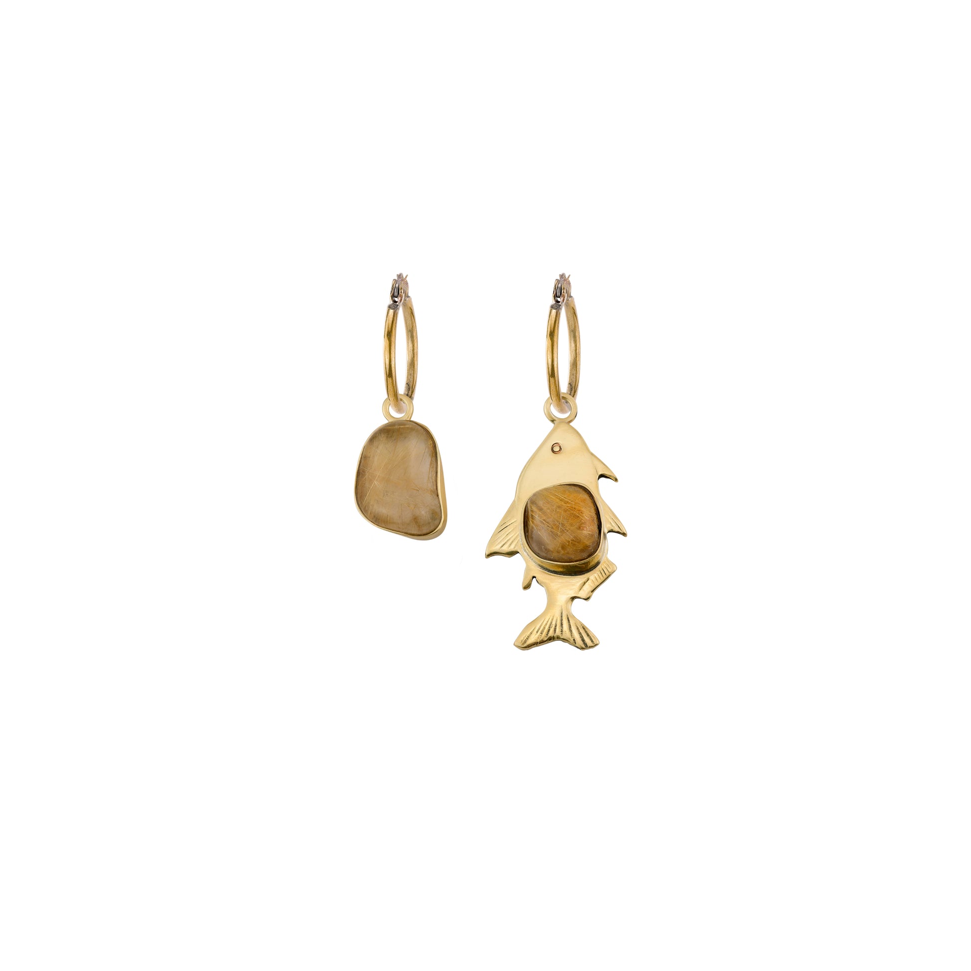 O brinco é composto por um par de argolas fechadas, produzidas em latão com pino de aço. Pingentes com pedra natural Quartzo Rutilado, pingente de peixe esculpido a partir do desenho da pedra. Acabamento Polido, sem banho e sem verniz. Você pode usar as argolas com ou sem os pingentes.