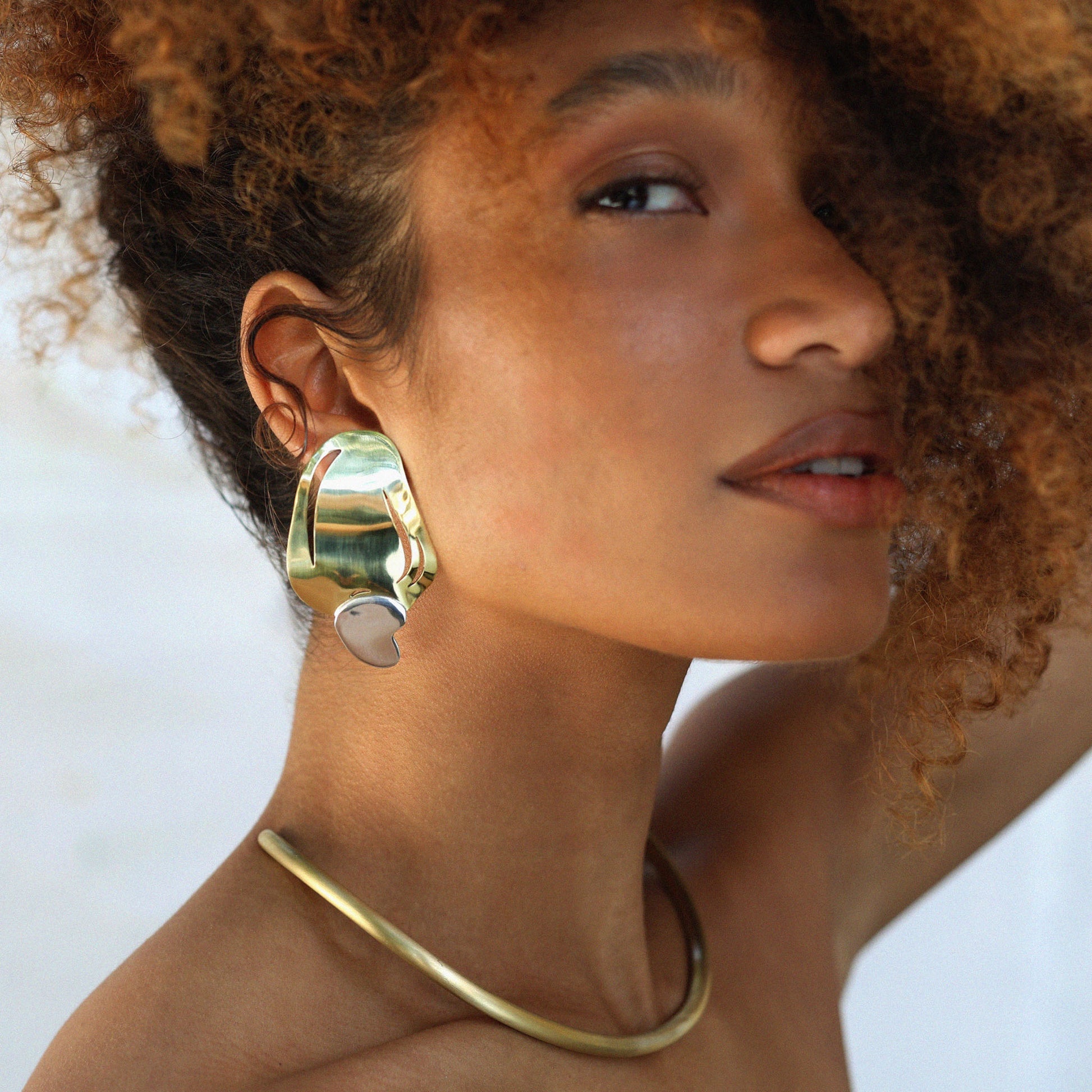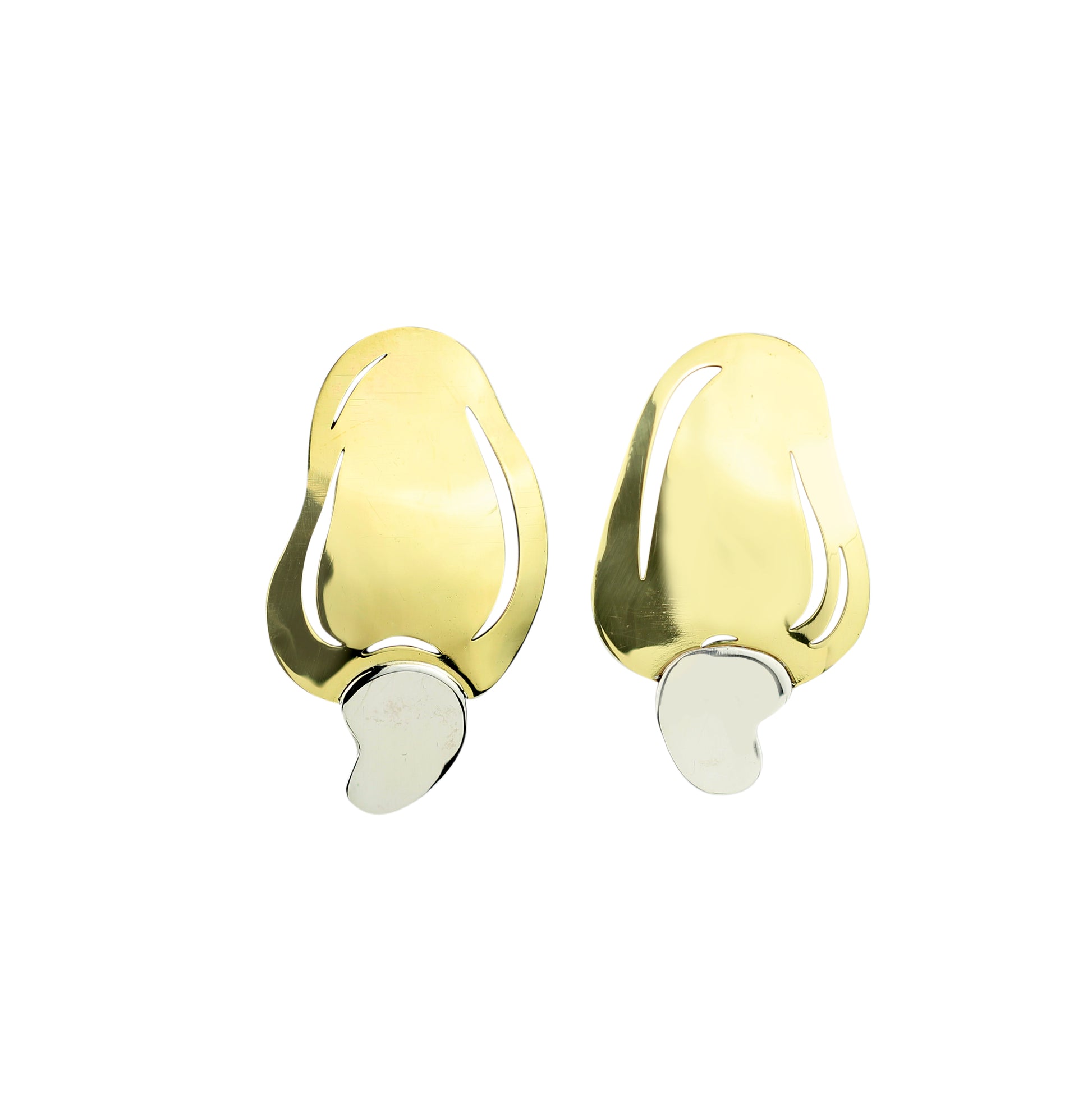 Brinco leve de latão e prata com acabamento polido, parte traseira, pino e tarraxa em prata. Produto sem banho e sem verniz.