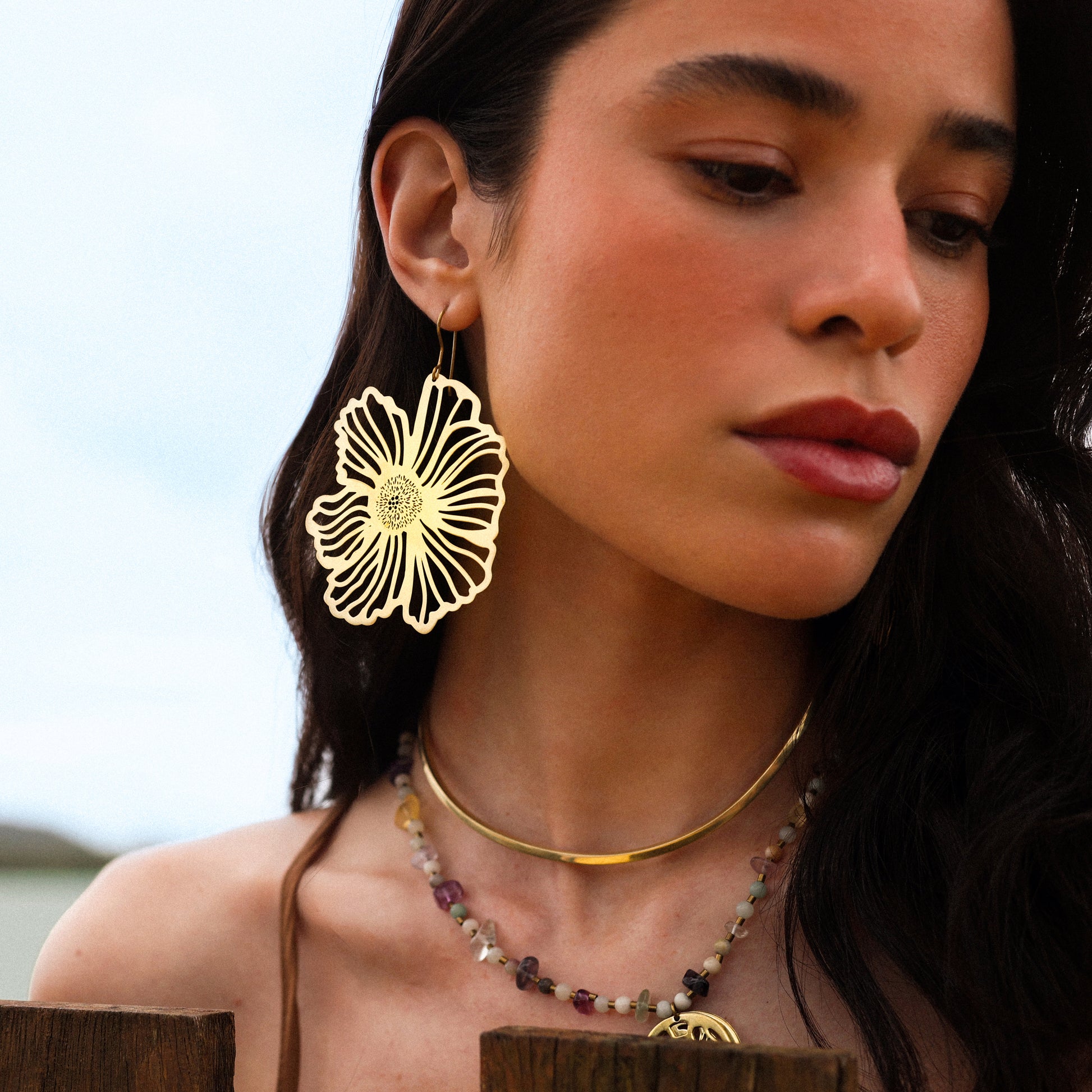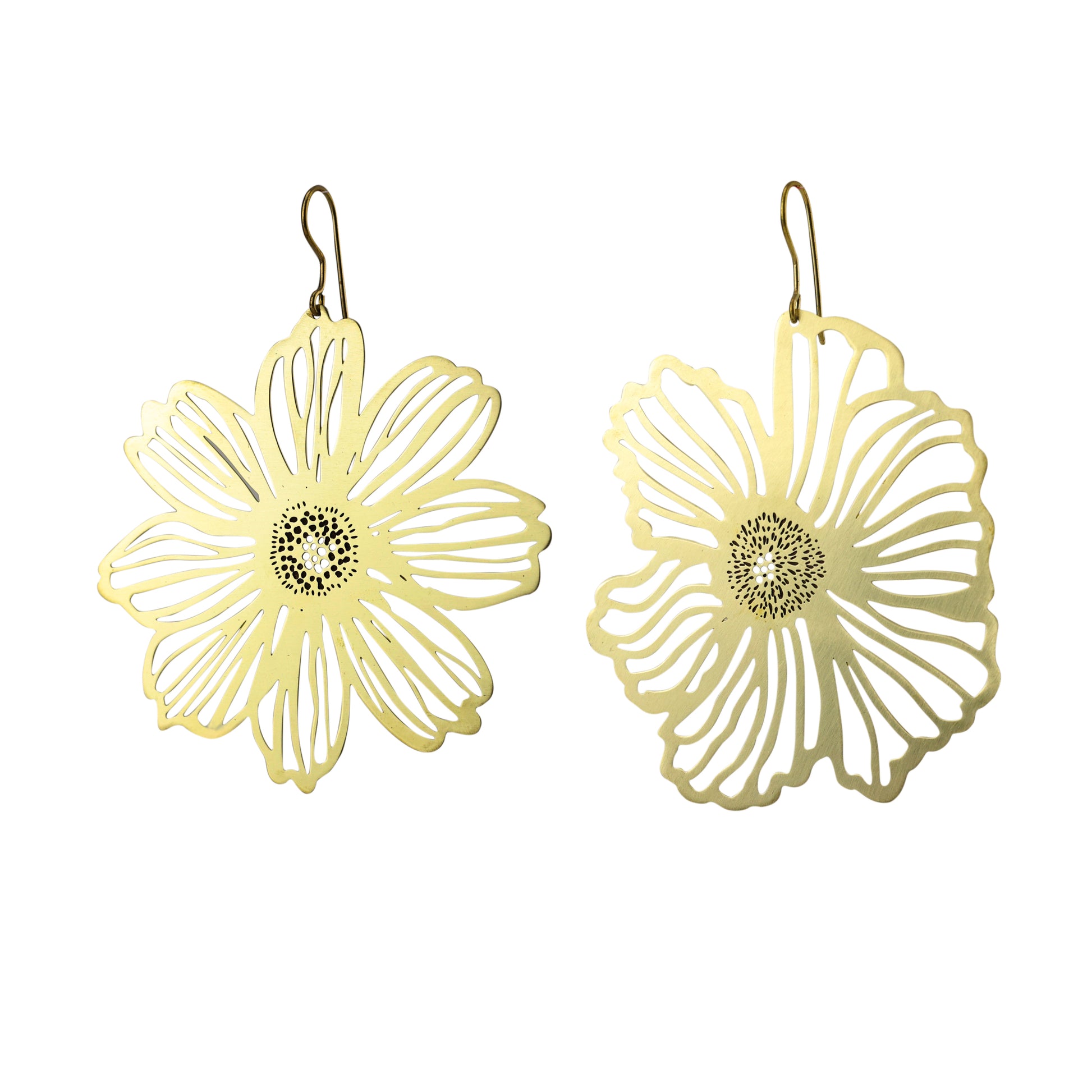 Brinco de flor vazada em latão bruto polido, medida da flor 7,6 cm x 7 cm.