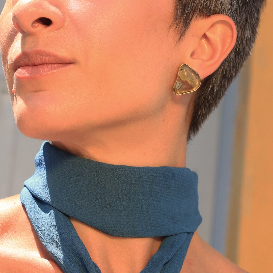 Brinco de latão com pedra Green Gold e acabamento polido, parte traseira, tarraxa e pino em prata. Produto sem banho e sem verniz.
