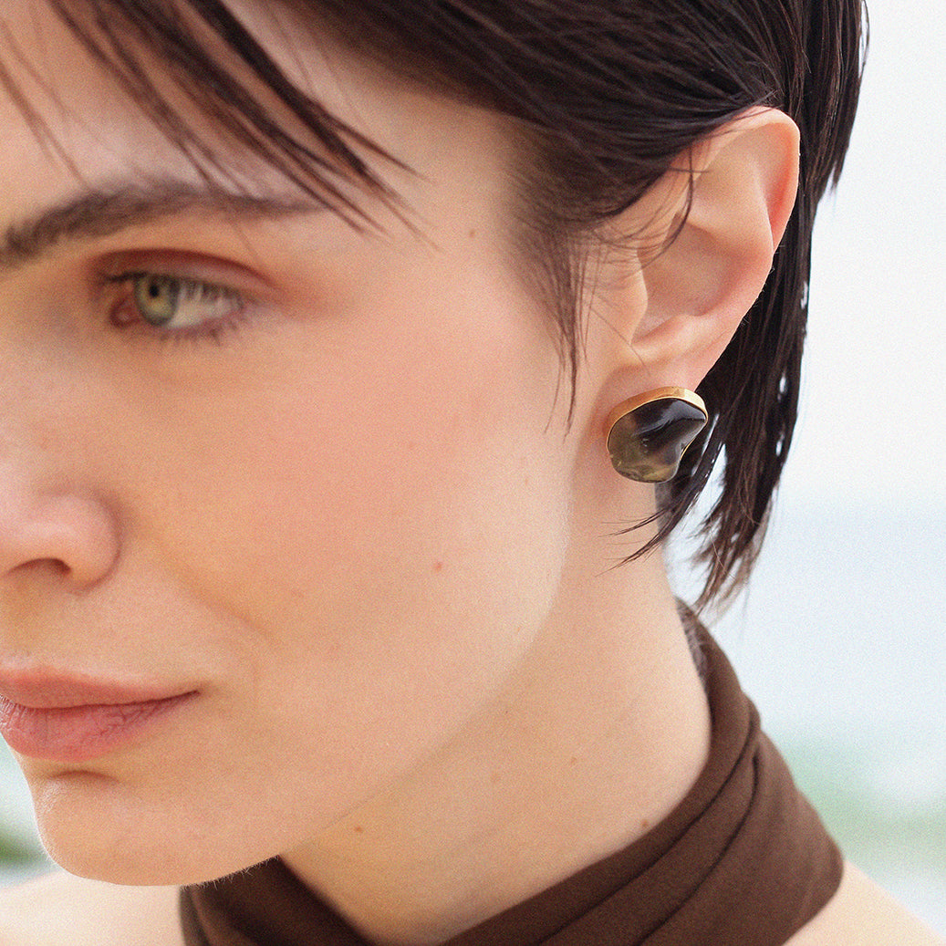 Brinco feito à mão de latão com acabamento polido e Quartzo Rutilado, parte traseira, tarraxa e pino em prata. Produto sem banho e sem verniz.
