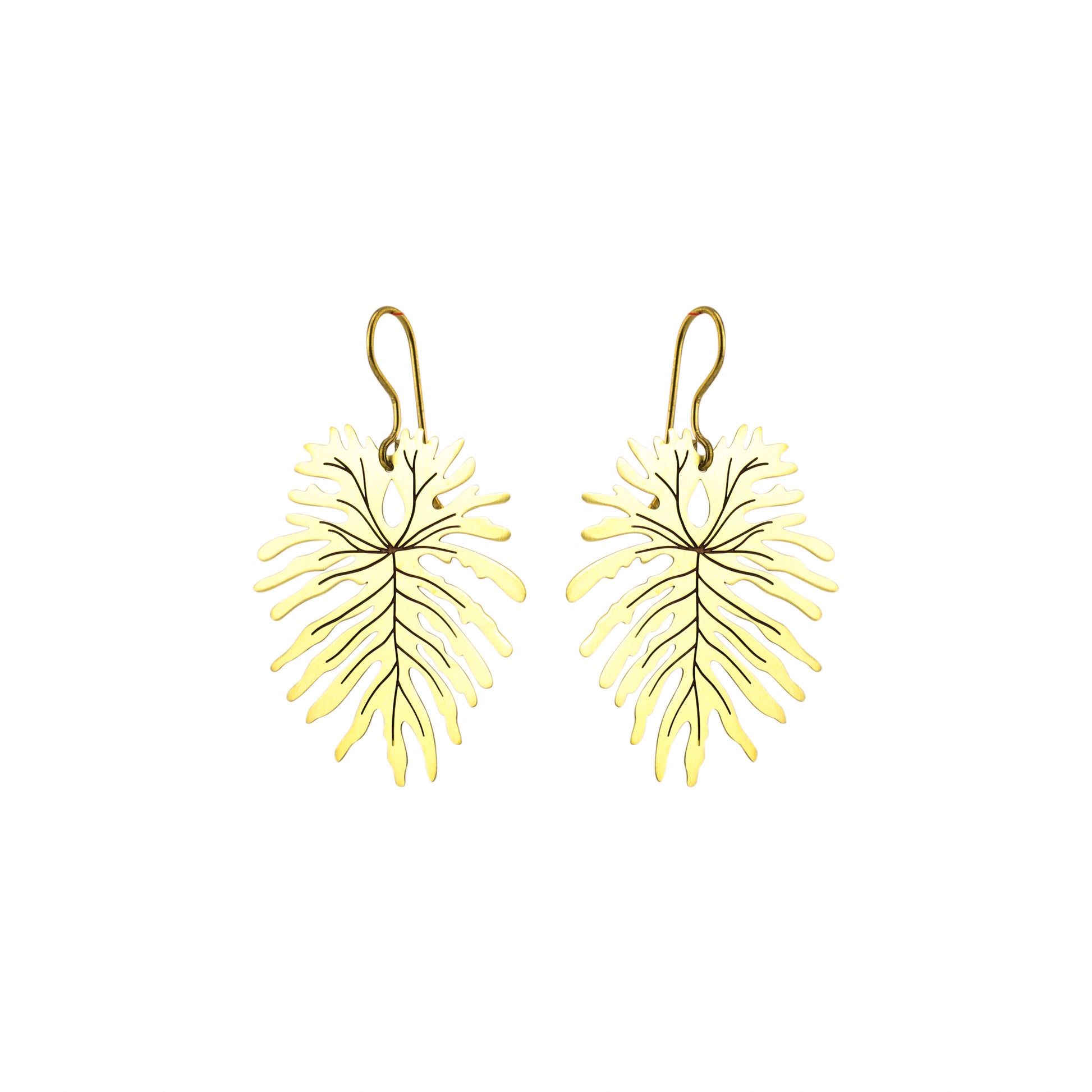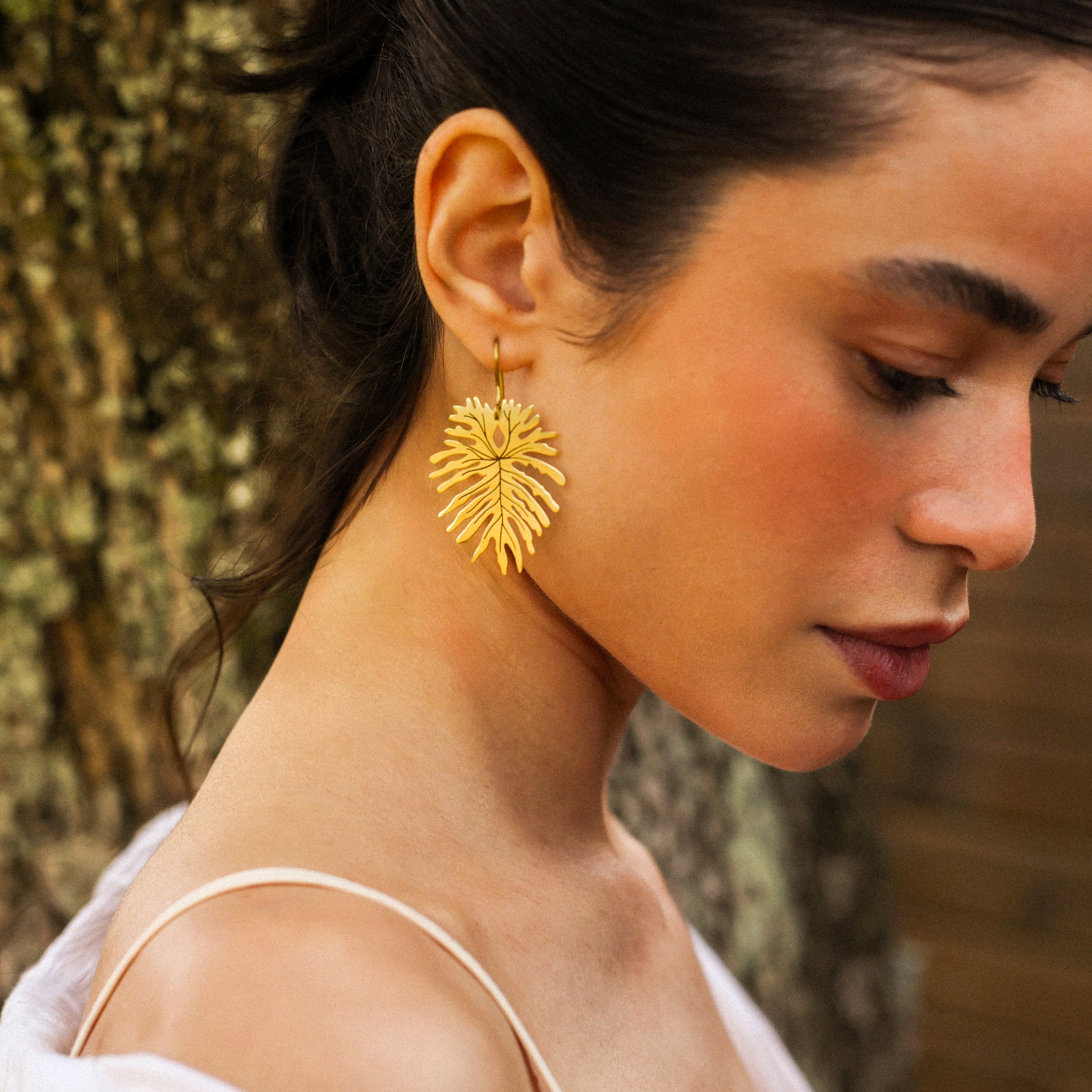 Brinco leve, feito de latão bruto polido no formato da folha do Guaimbé, levemente assimétrico.