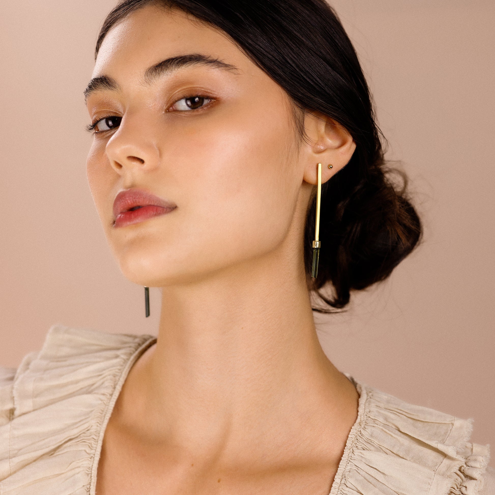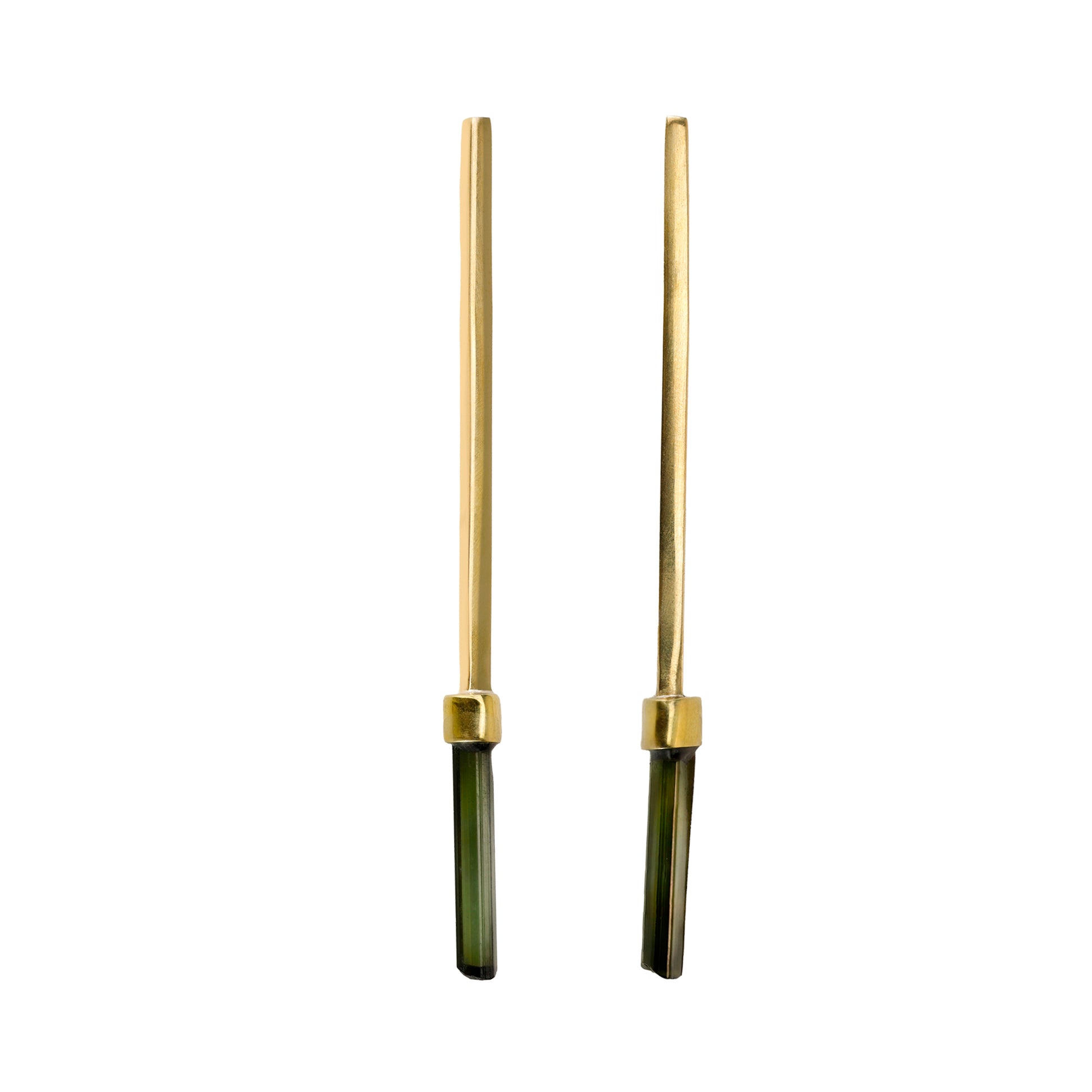 Brinco longo de latão polido com canudos de turmalina verde. A parte traseira, tarraxa e pino são em prata e o produto sem banho e sem verniz. Brinco com comprimento total de 8 cm.