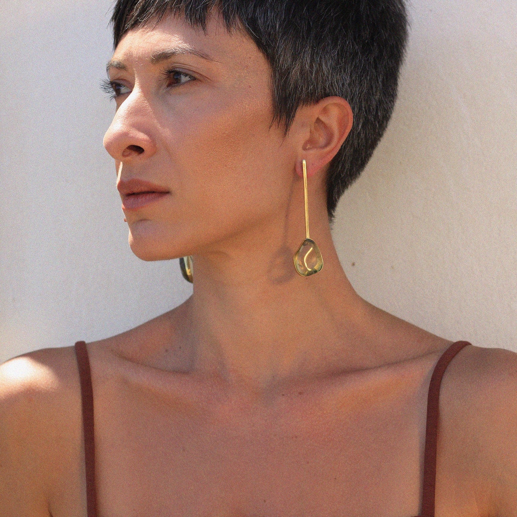 Brinco de latão com pedra rolada Green Gold e acabamento polido, parte traseira, tarraxa e pino em prata. Produto sem banho e sem verniz.