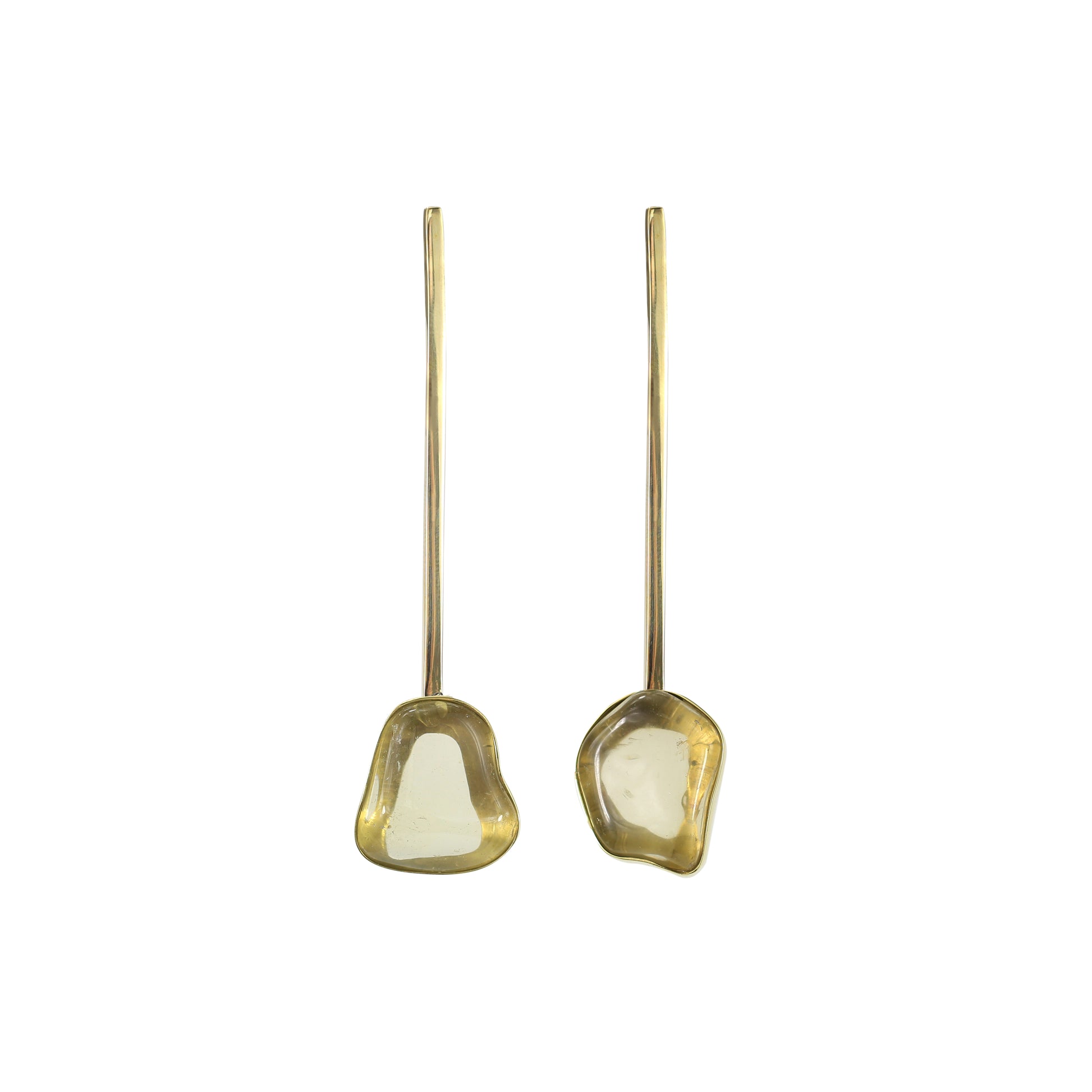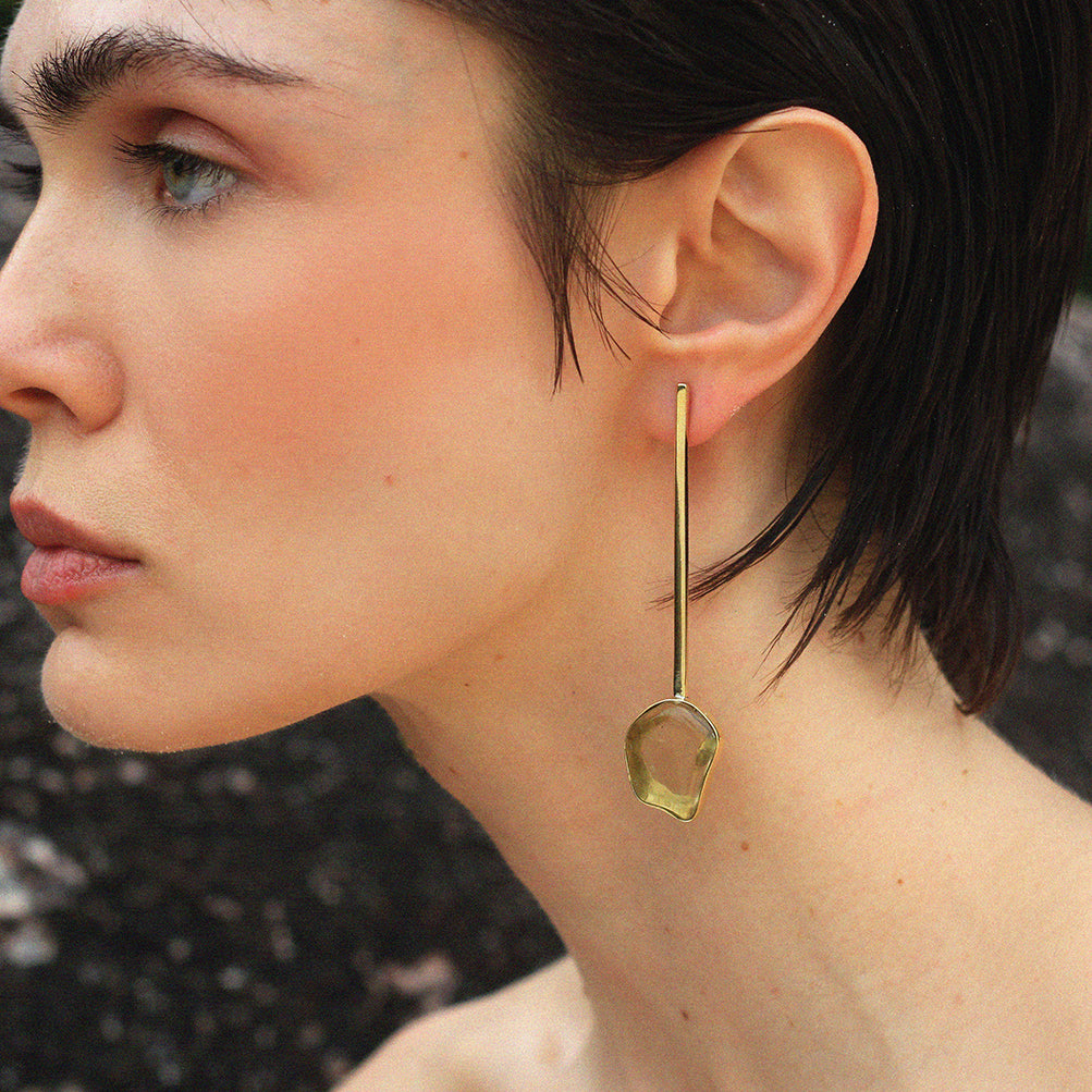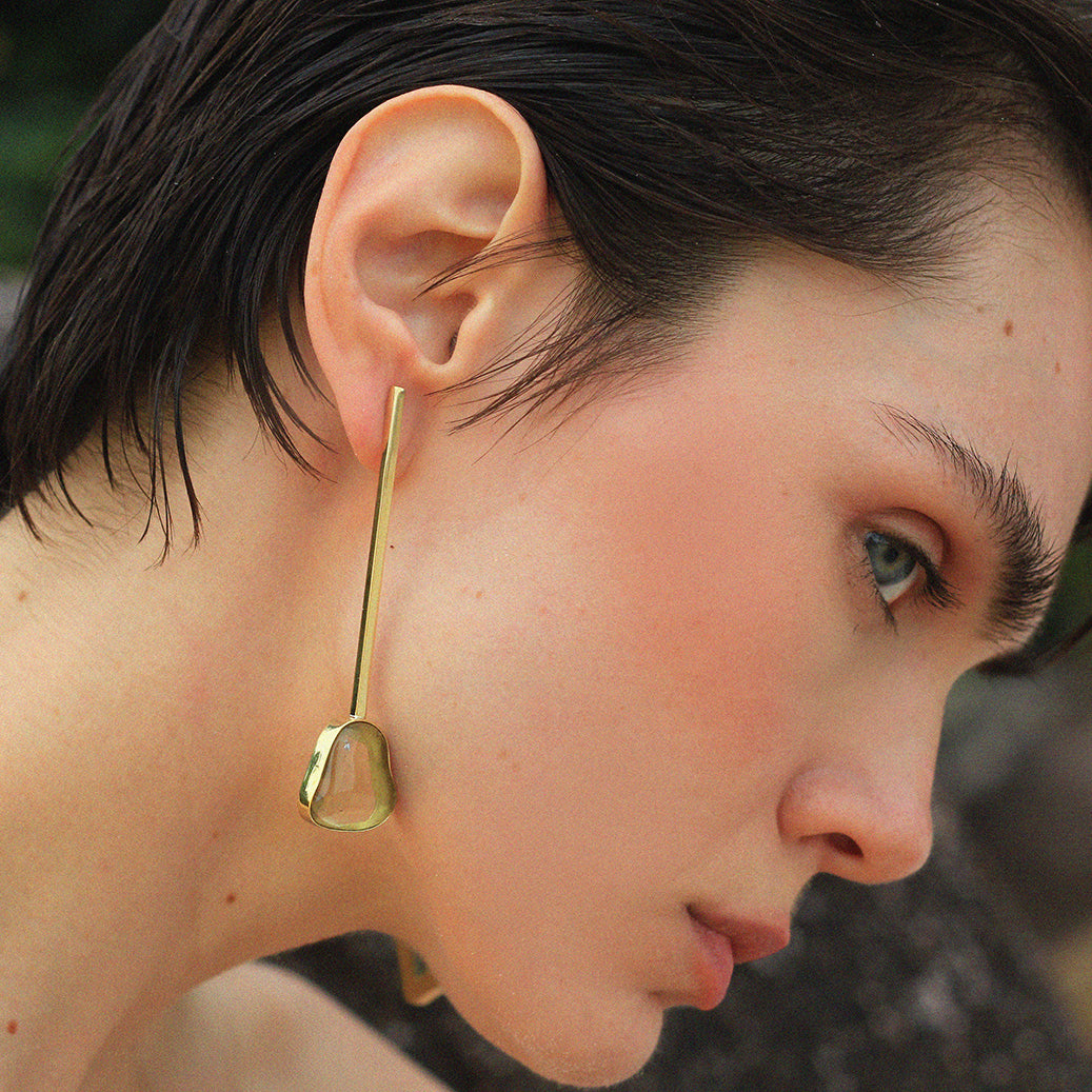 Brinco de latão com pedra Green Gold e acabamento polido, parte traseira, tarraxa e pino em prata. Produto sem banho e sem verniz.
