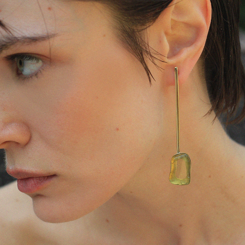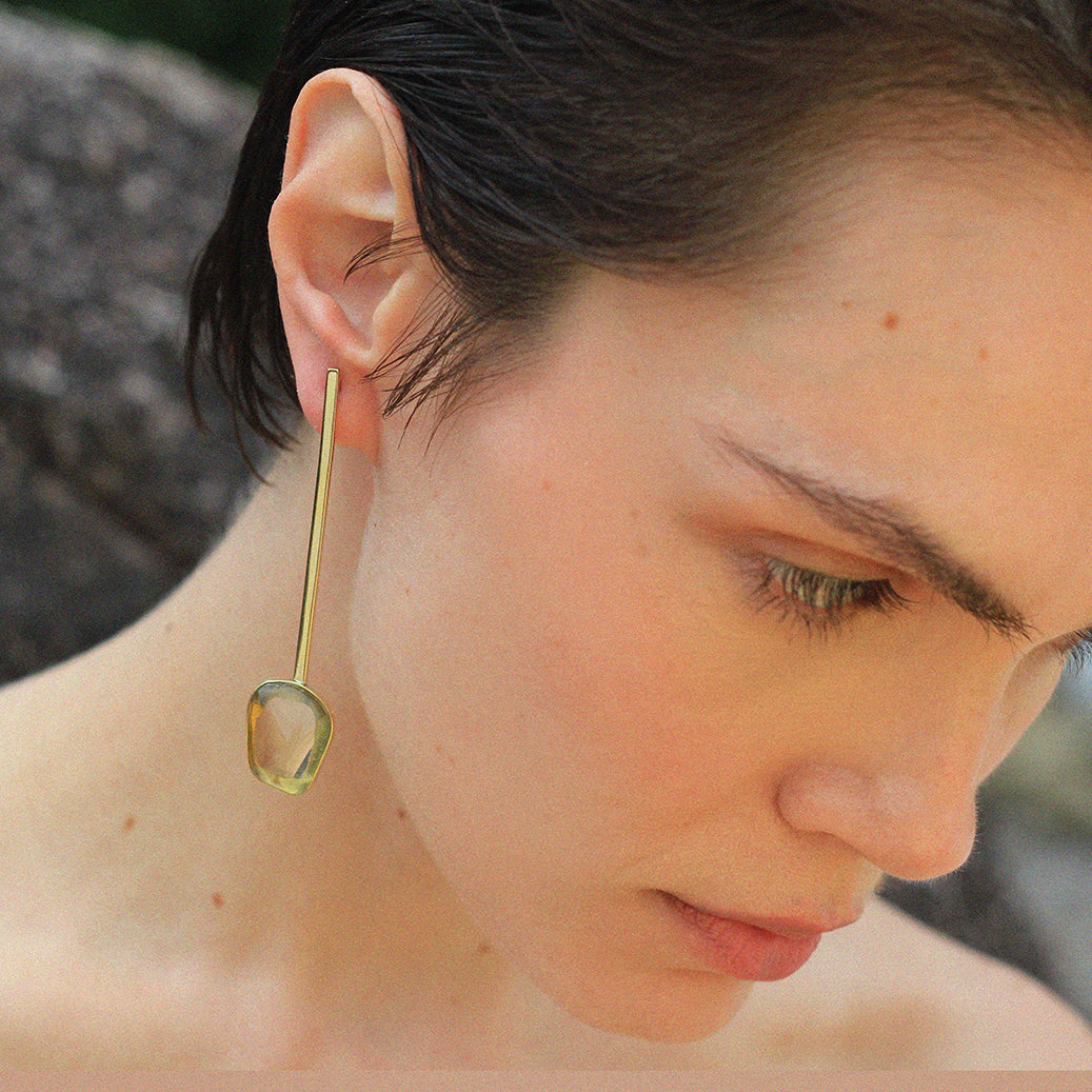Brinco de latão com pedra Green Gold e acabamento polido, com parte traseira, tarraxa e pino em prata. Produto sem banho e sem verniz.