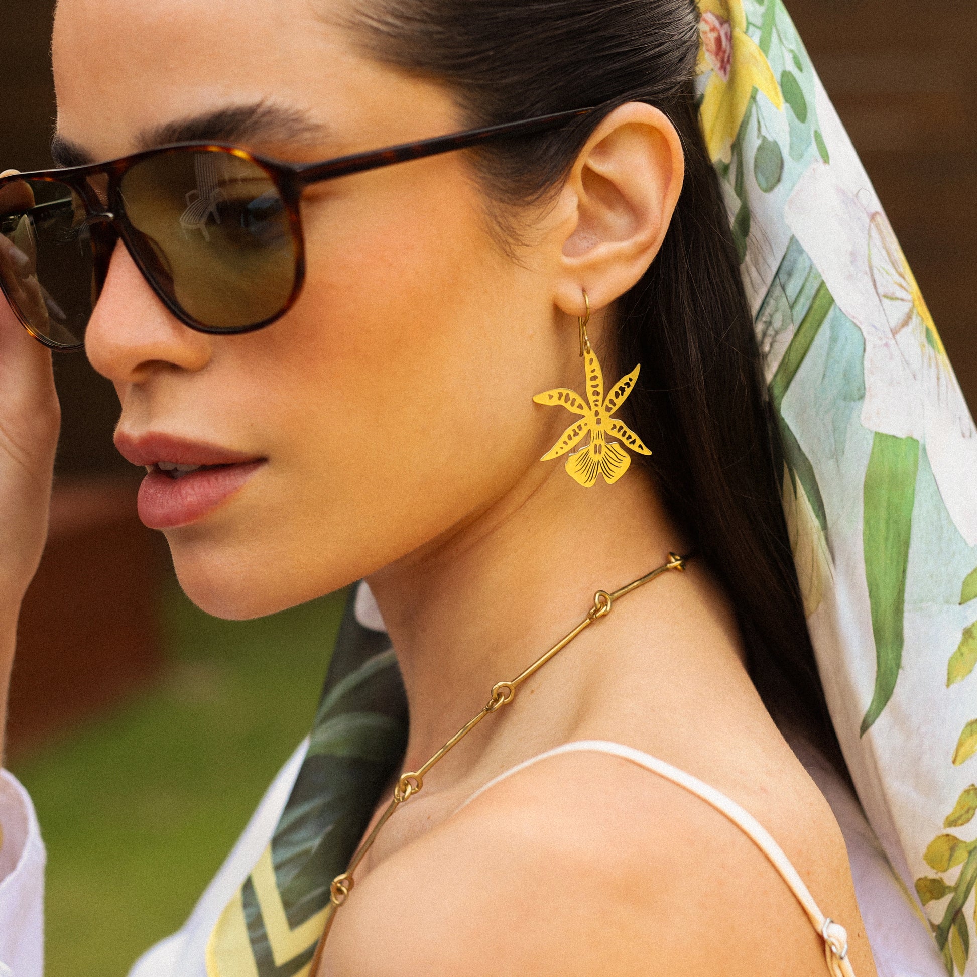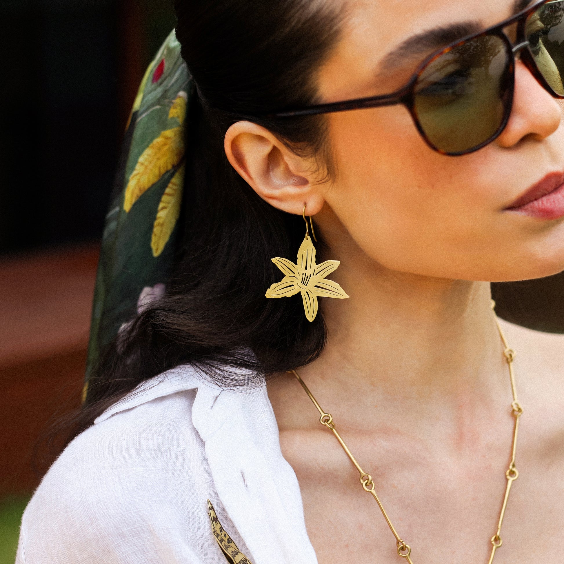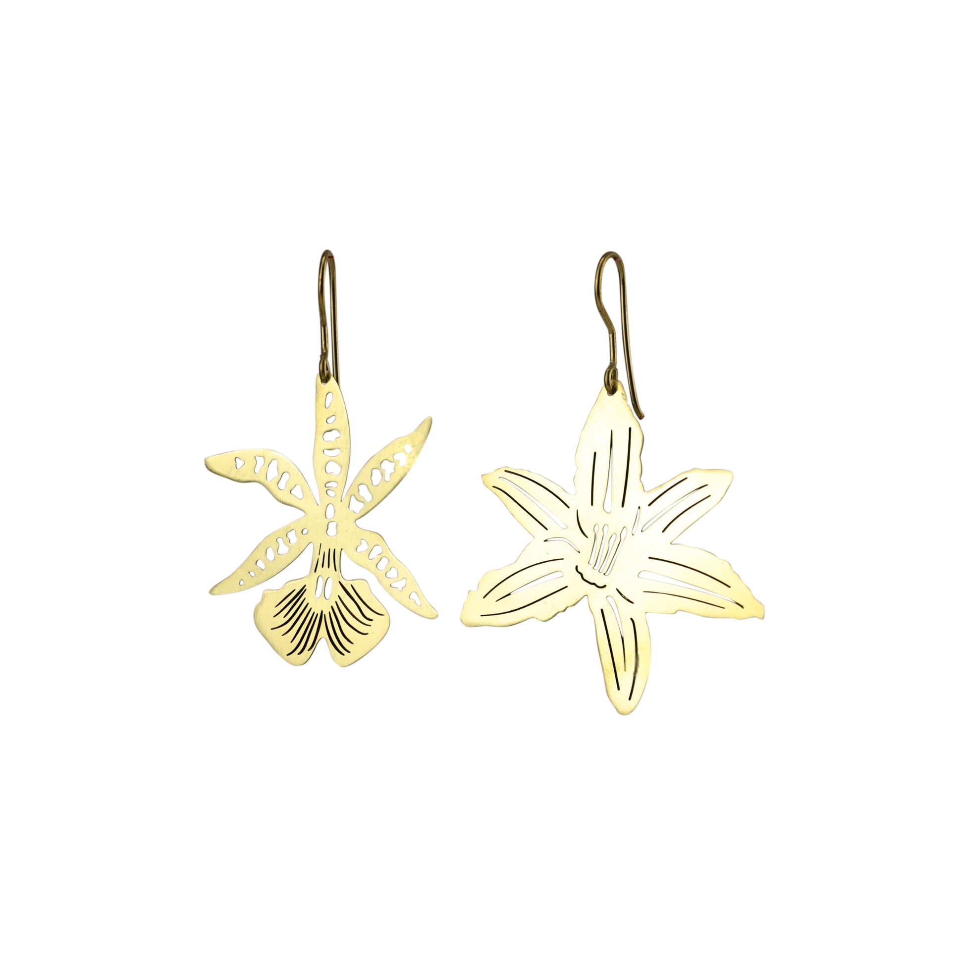 Brinco leve, assimétrico, feito de latão bruto polido no formato da folha do lírio e da flor de orquídea.