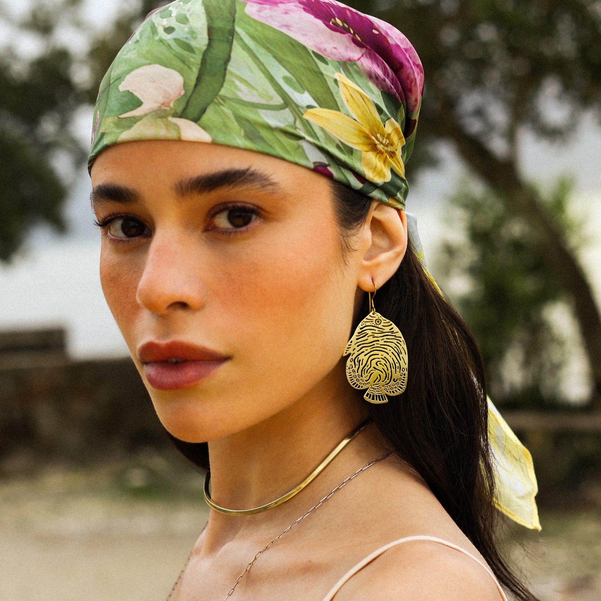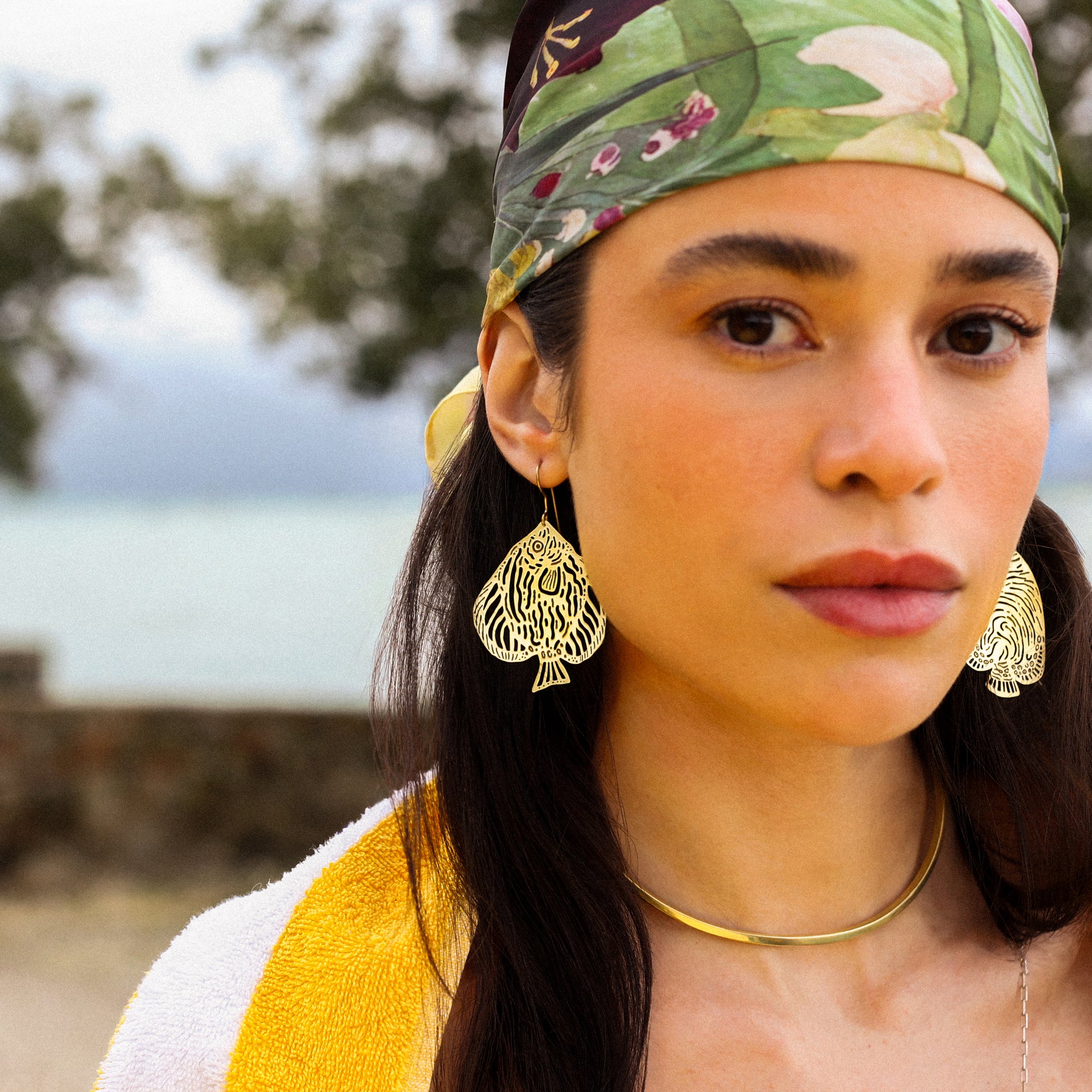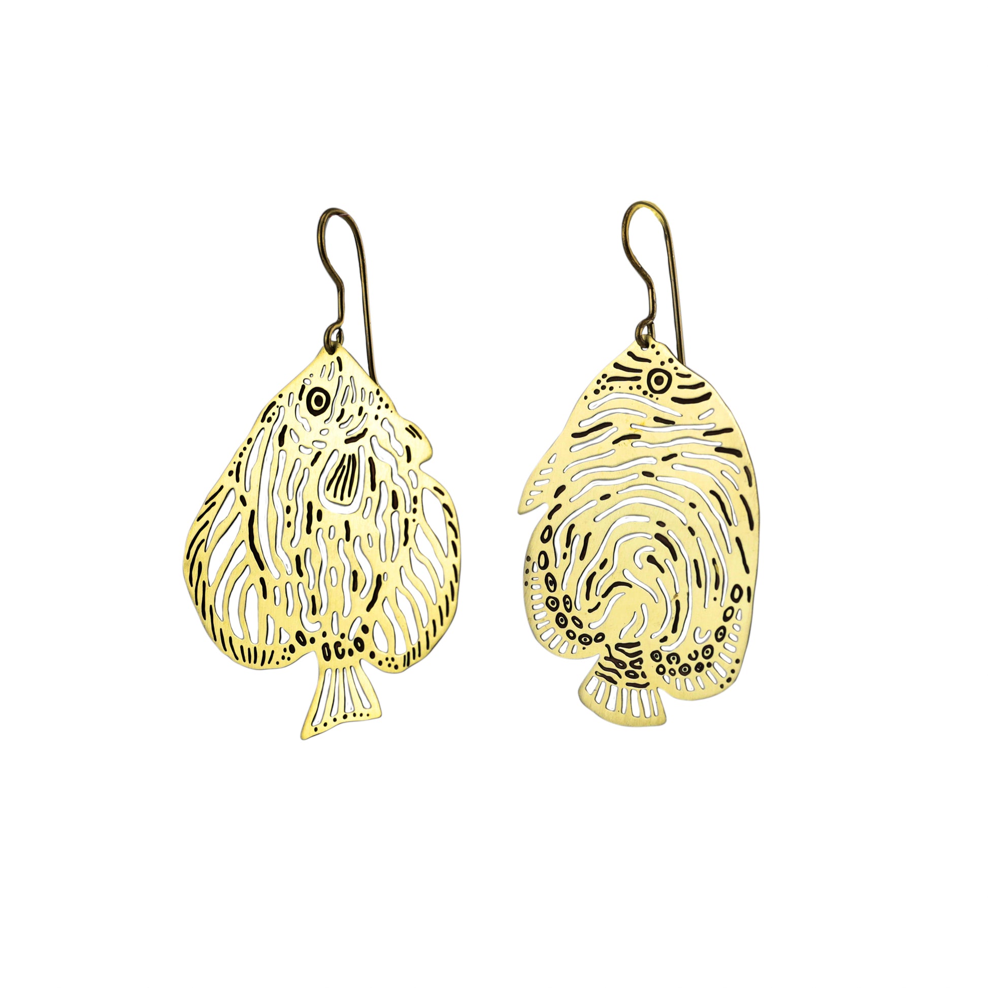 Brinco leve, assimétrico, feito de latão bruto polido no formato de peixe.