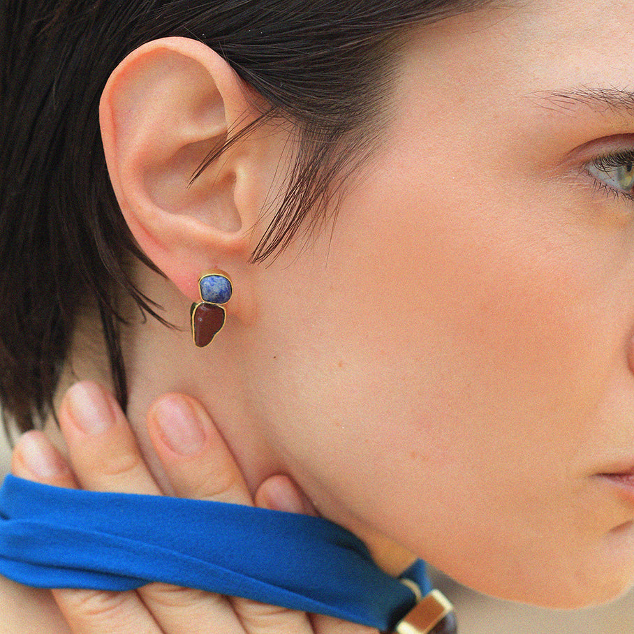 Brinco feito à mão de latão com acabamento polido, Quartzo Azul e Jaspe Vermelha, com parte traseira, tarraxa e pino em prata. Produto sem banho e sem verniz.