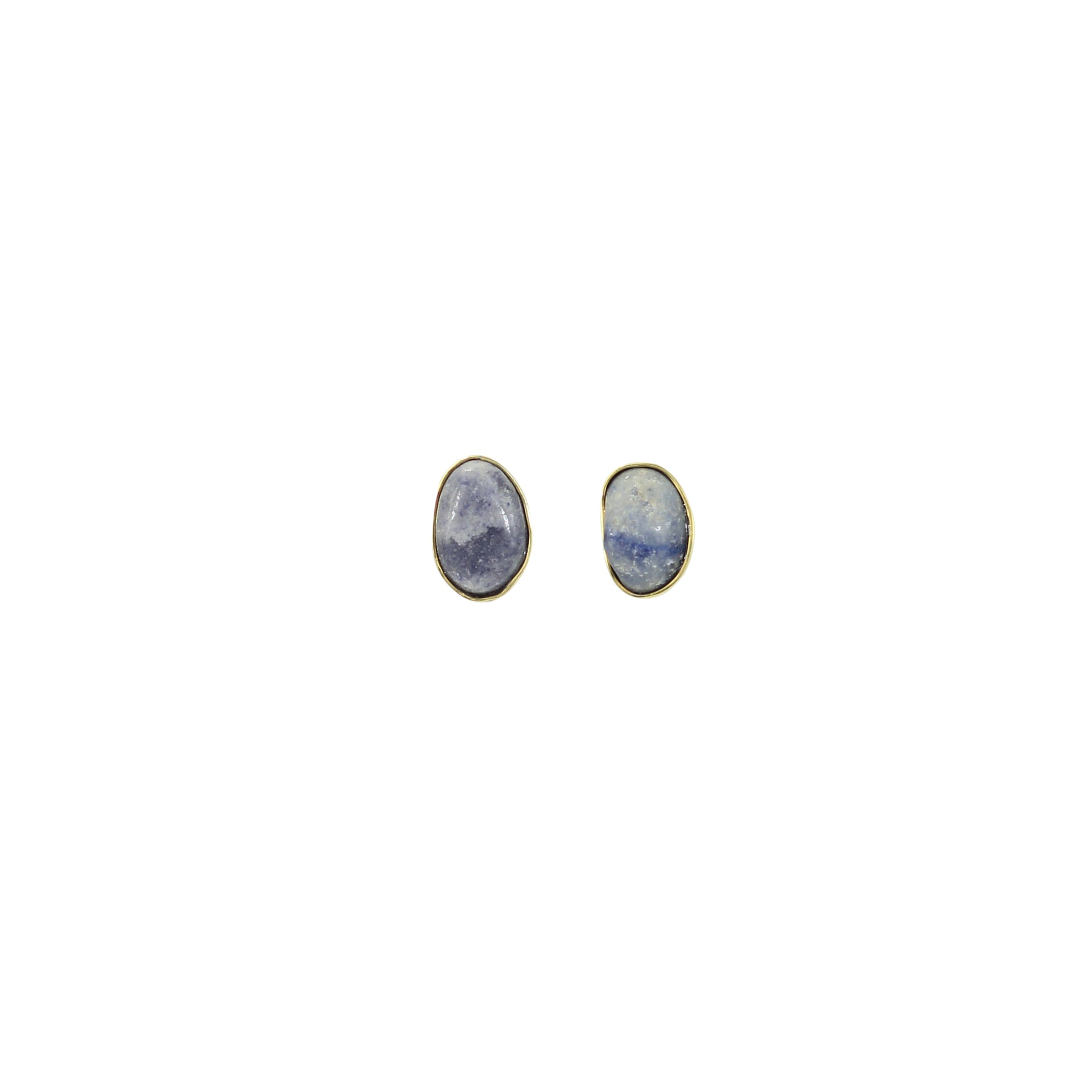 Brinco feito à mão de latão com acabamento polido e Quartzo Azul com parte traseira, tarraxa e pino em prata. Produto sem banho e sem verniz.