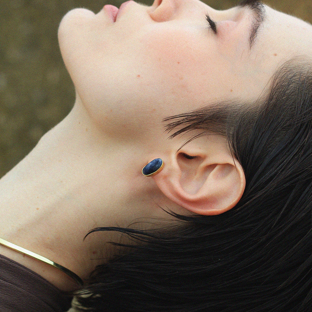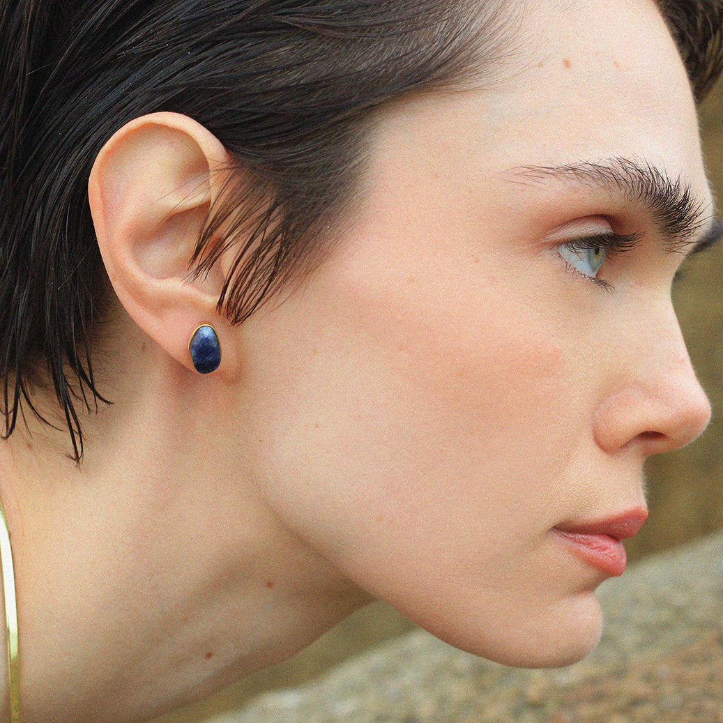 Brinco feito à mão de latão com acabamento polido e Quartzo Azul com parte traseira, tarraxa e pino em prata. Produto sem banho e sem verniz.