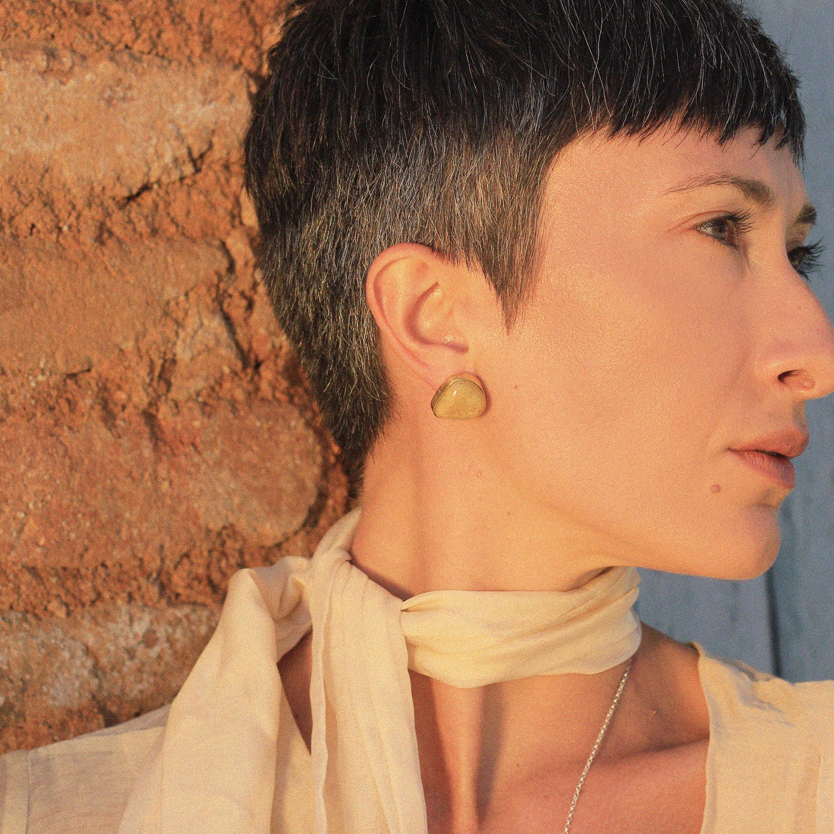 Brinco feito à mão de latão com acabamento polido e Quartzo Rutilado parte traseira, tarraxa e pino em prata. Produto sem banho e sem verniz.