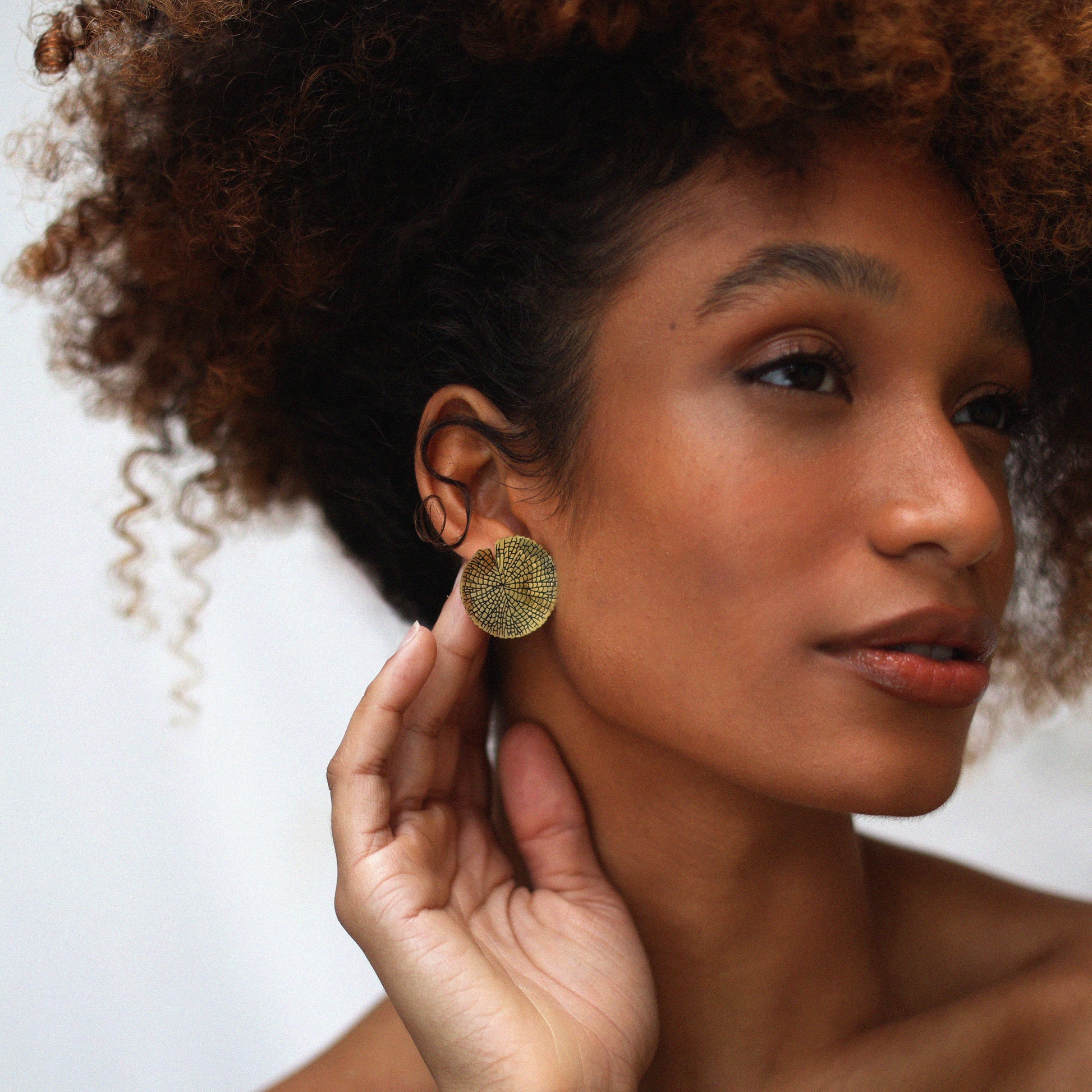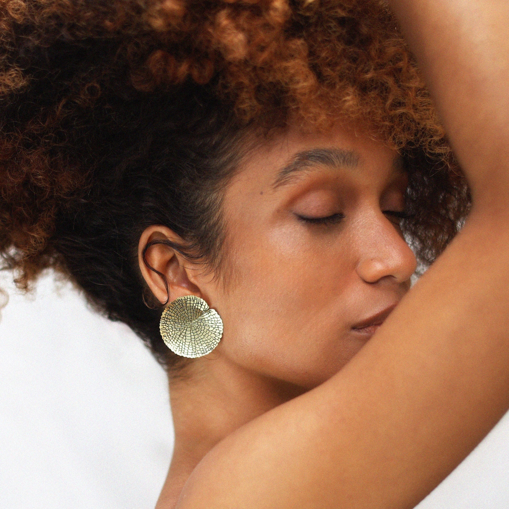 Brinco Vitória Régia, em latão com acabamento fosco e parte traseira, tarraxa e pino em prata, sem banho e sem verniz.