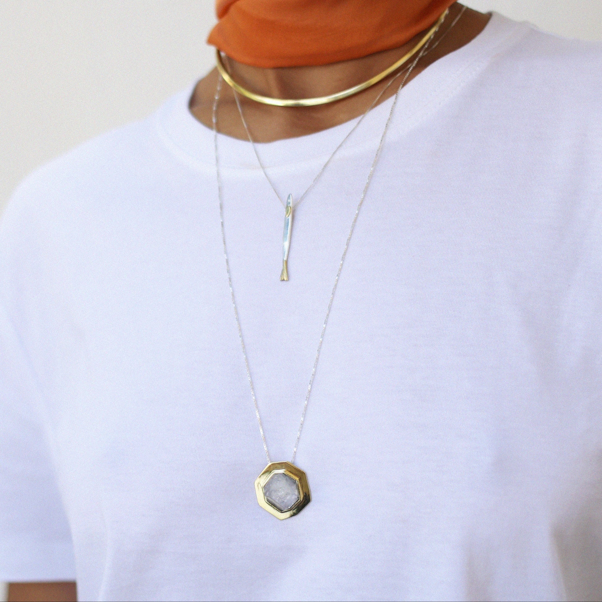 Corrente veneziana de prata com pingente de pedra apofolita feito de latão com acabamento polido. Peça sem banho e sem verniz.