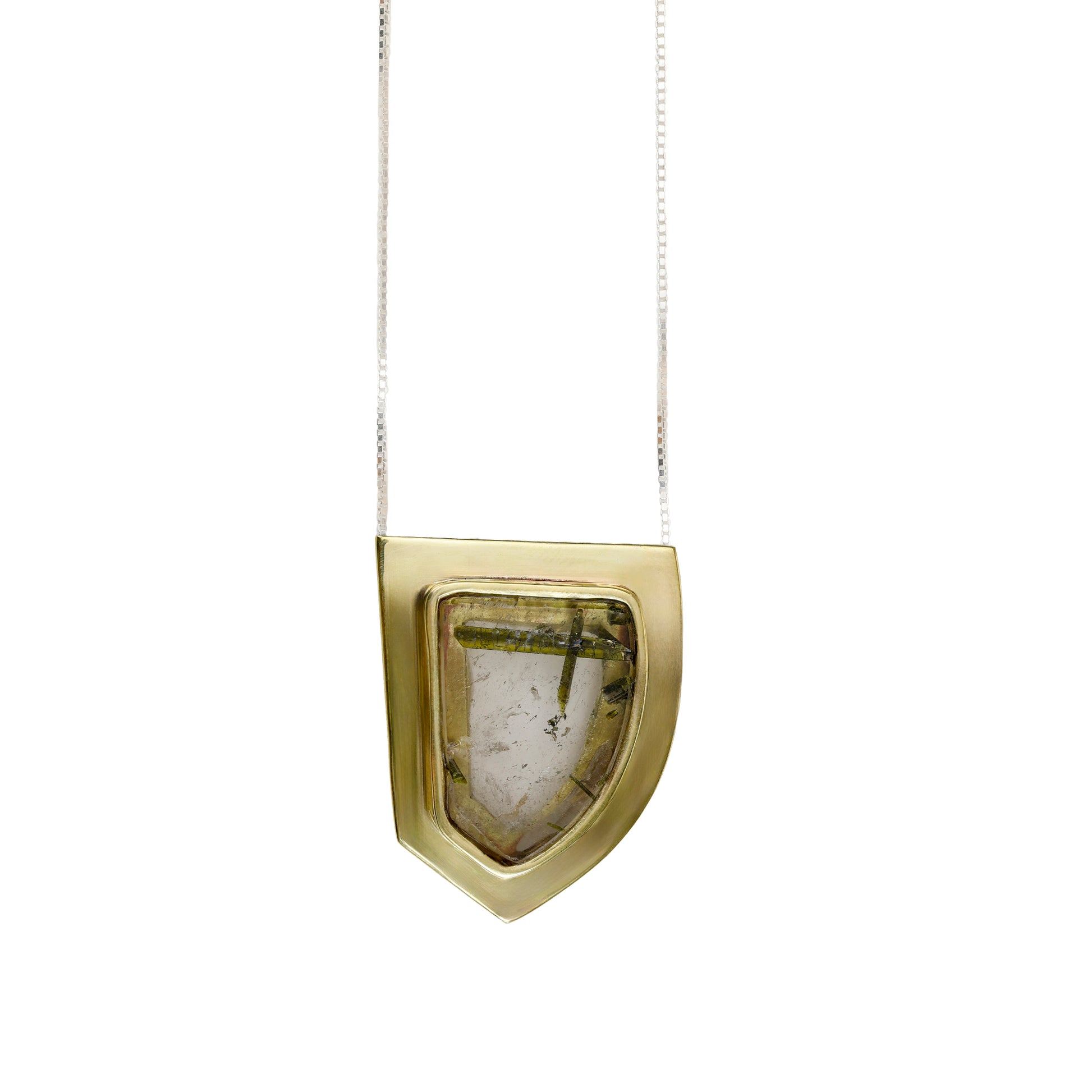 Corrente veneziana de prata com pingente de pedra Quartzo & Epidoto com acabamento em latão polido. Peça sem banho e sem verniz.