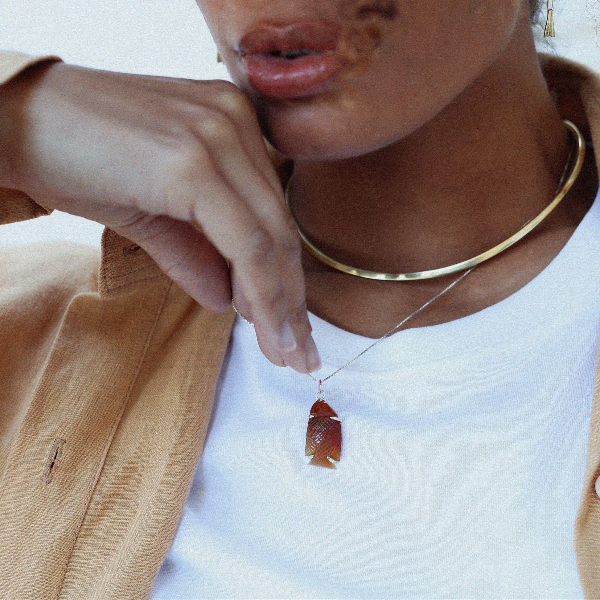 Corrente veneziana de prata 950 com pingente de peixe esculpido em ágata.