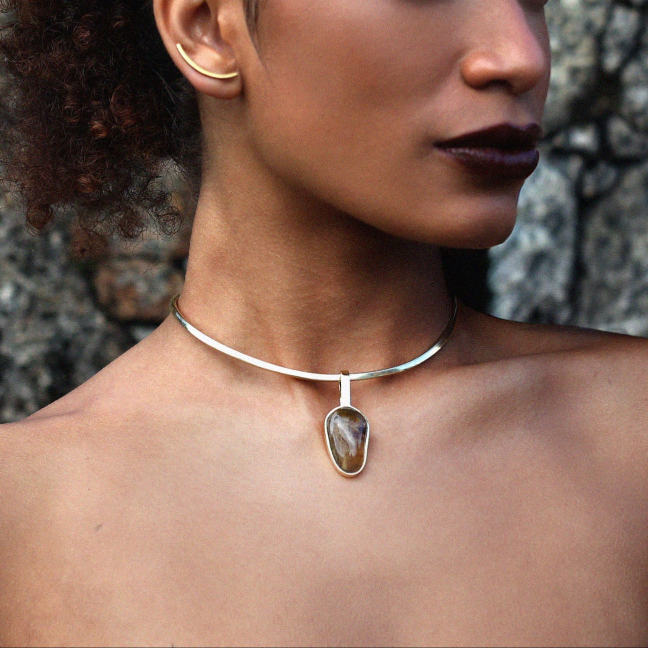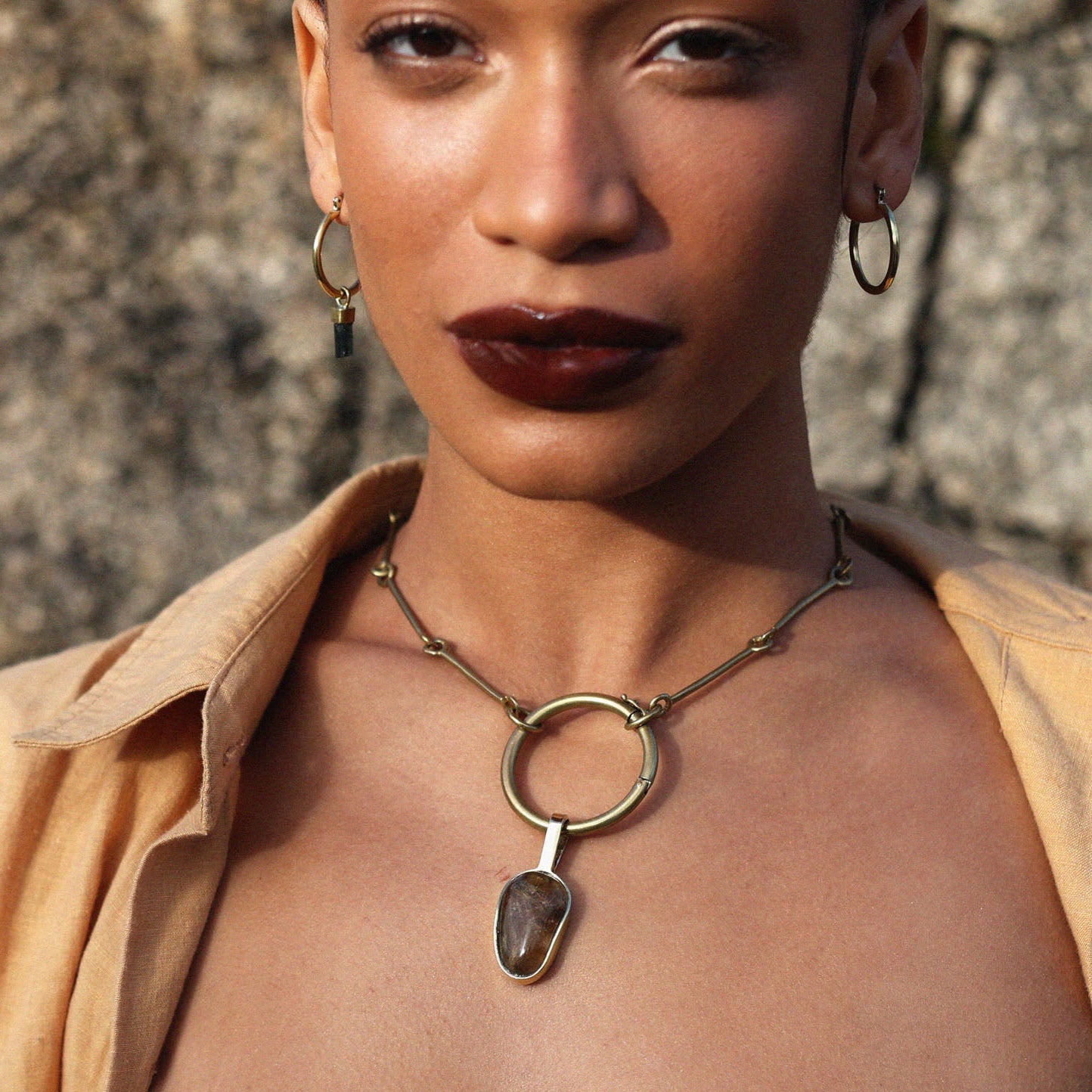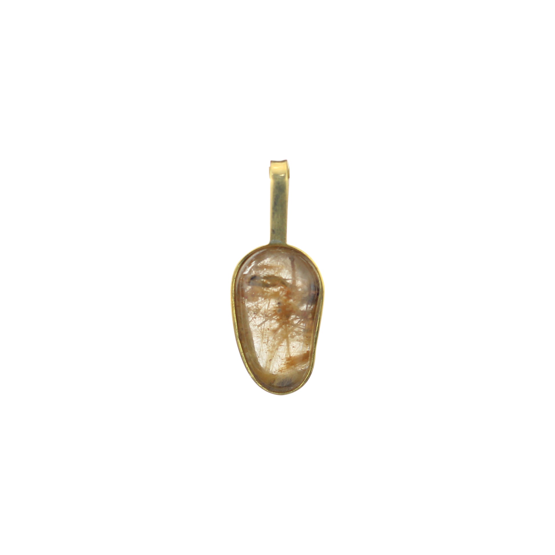 Pingente único em latão envolvendo um quartzo rutilado. Acabamento polido. Peça sem banho e sem verniz. Ele pode ser usado em lenços, choker fino e grosso ou no nosso mosquetão.