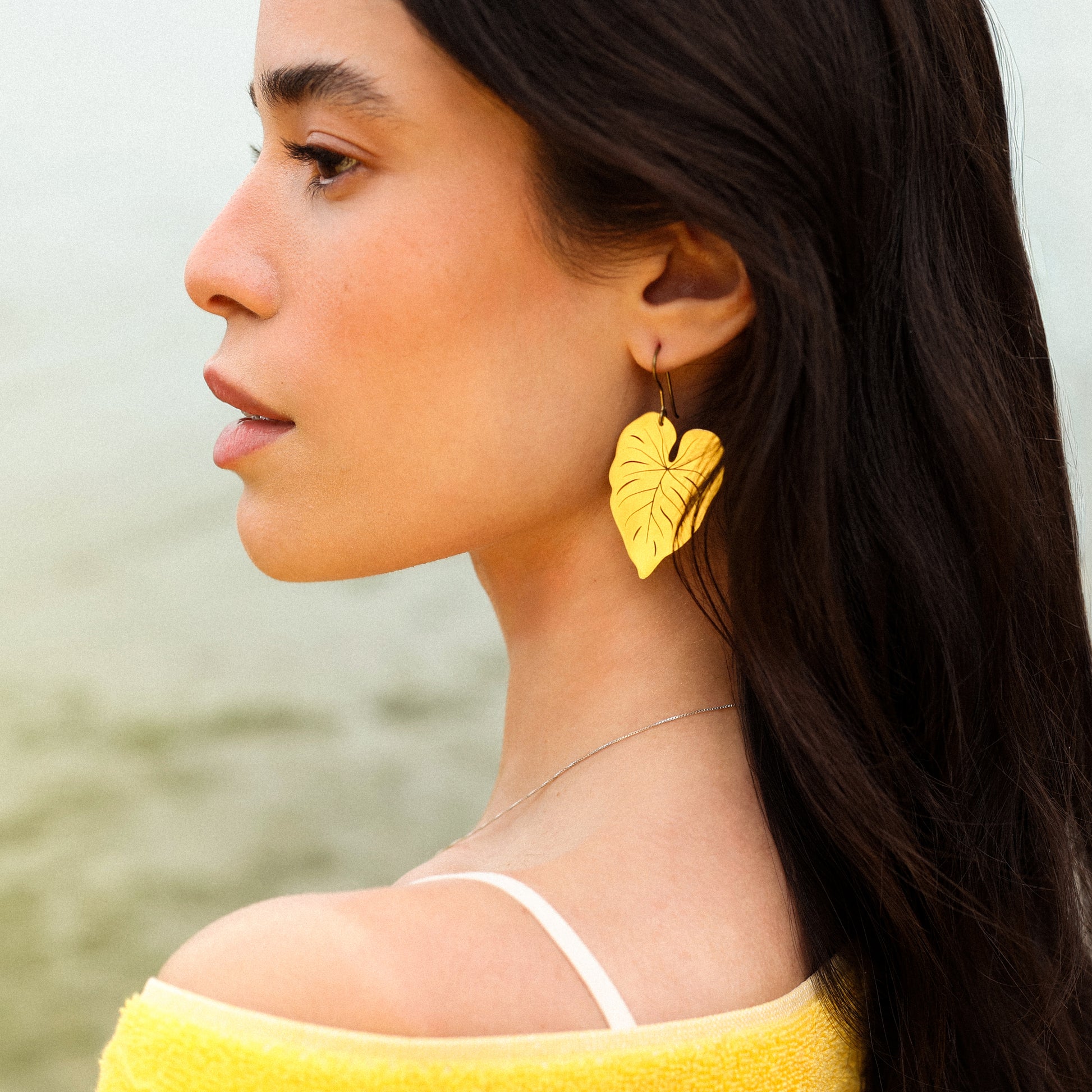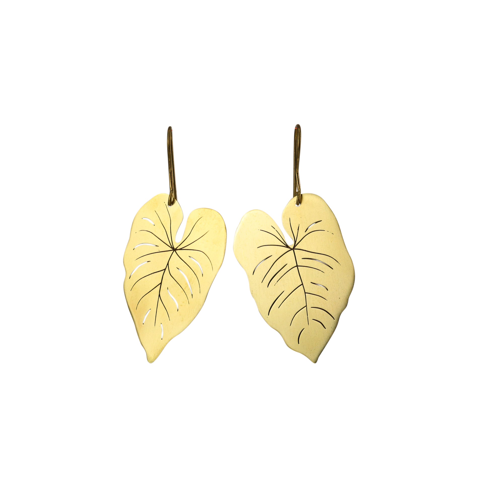 Brinco leve, feito de latão bruto polido no formato da folha antúrio, levemente assimétrico.
