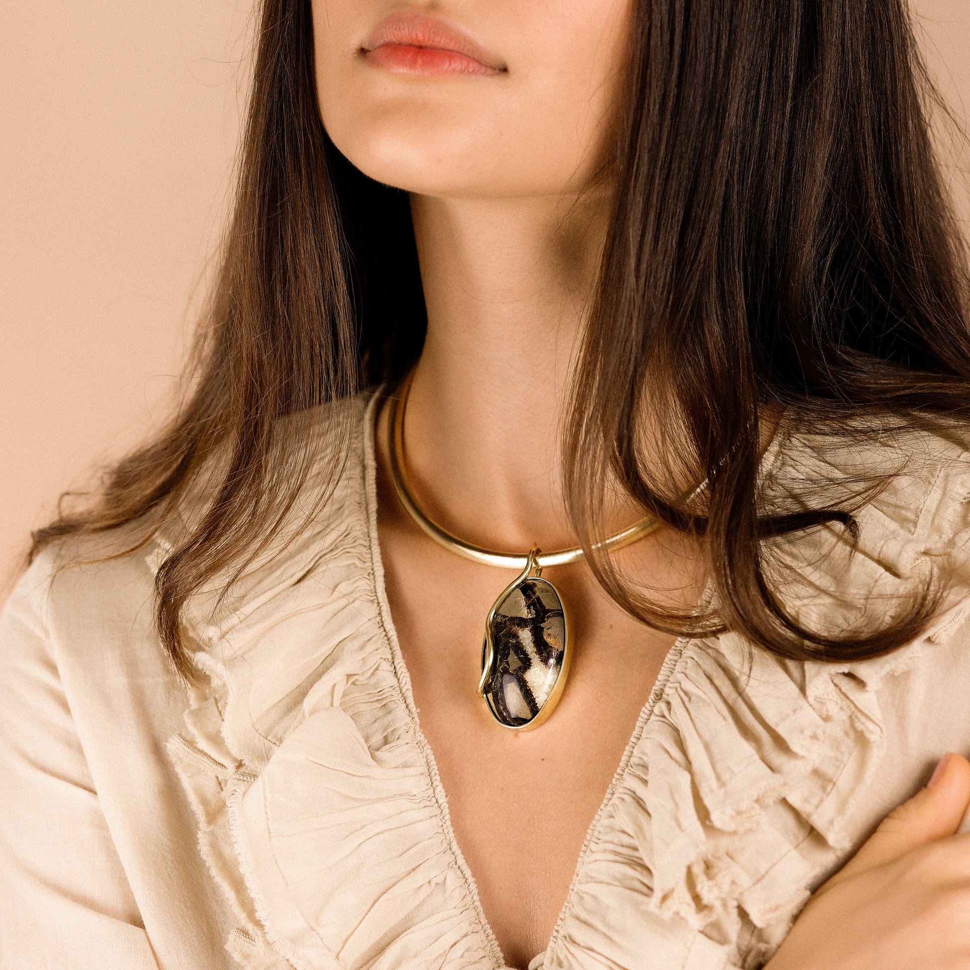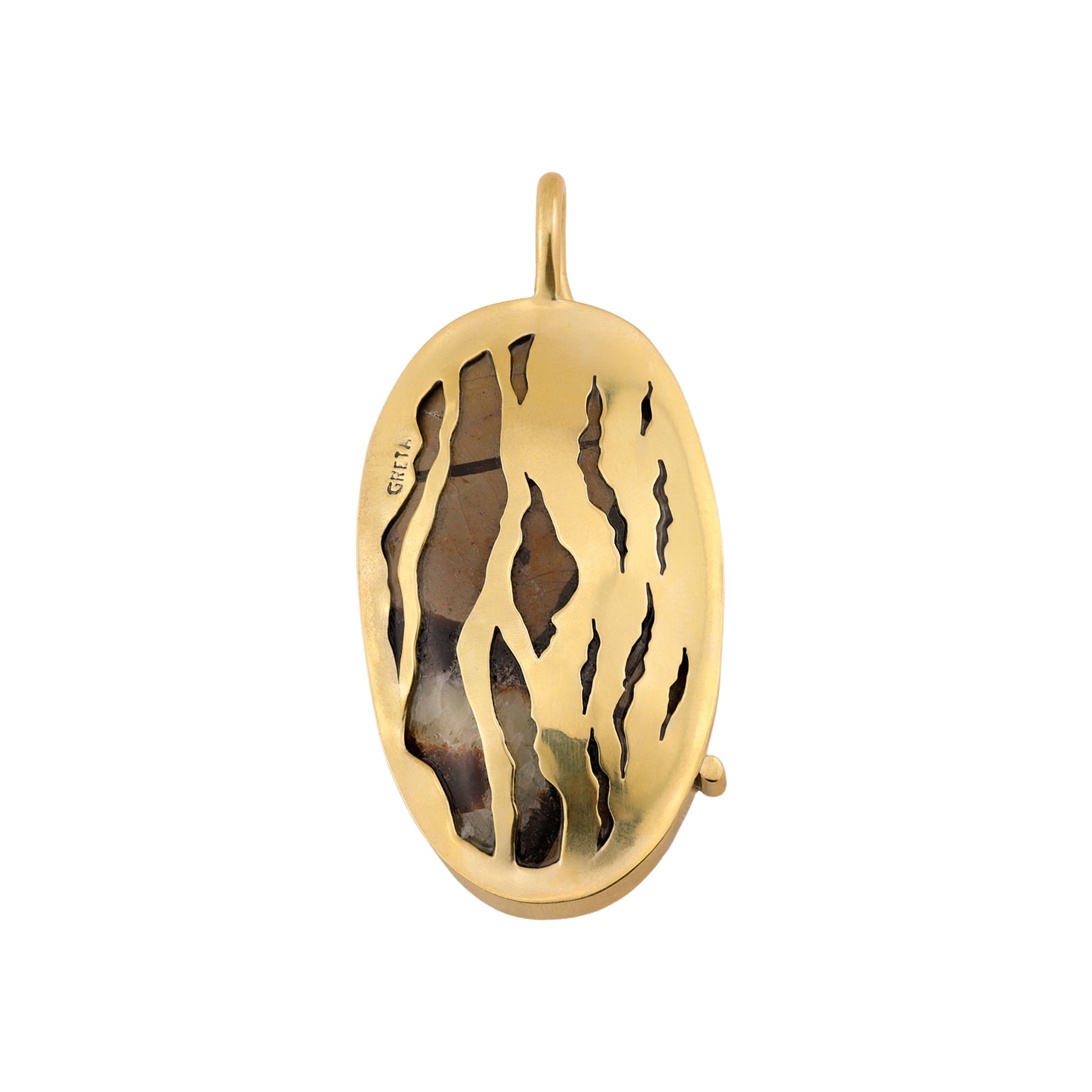 Pingente único em latão envolvendo uma jaspe septariana. No verso do pingente foram trabalhadas texturas feitas à mão representando o encontro dos Rios Negro e Solimões, na parte frontal os detalhes representam as ondas. Acabamento polido. Peça sem banho e sem verniz. Ele pode ser usado em lenços, choker fino e grosso ou no nosso mosquetão.