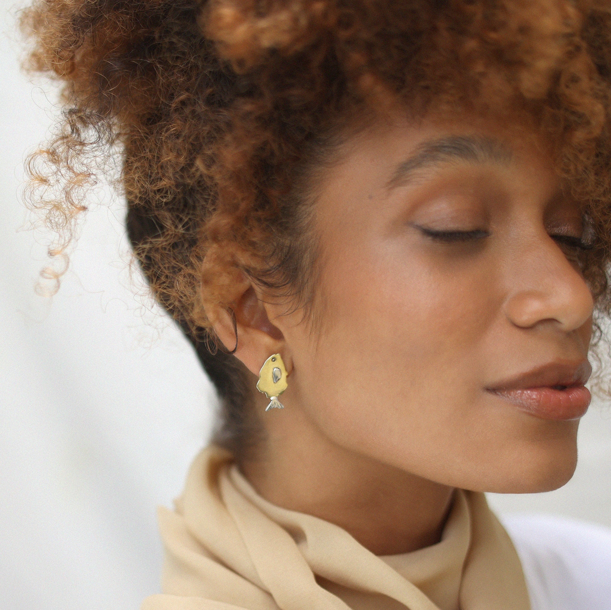 Brinco feito à mão de latão e detalhes em prata, com acabamento polido, com parte traseira e pino em prata. Produto sem banho e sem verniz.