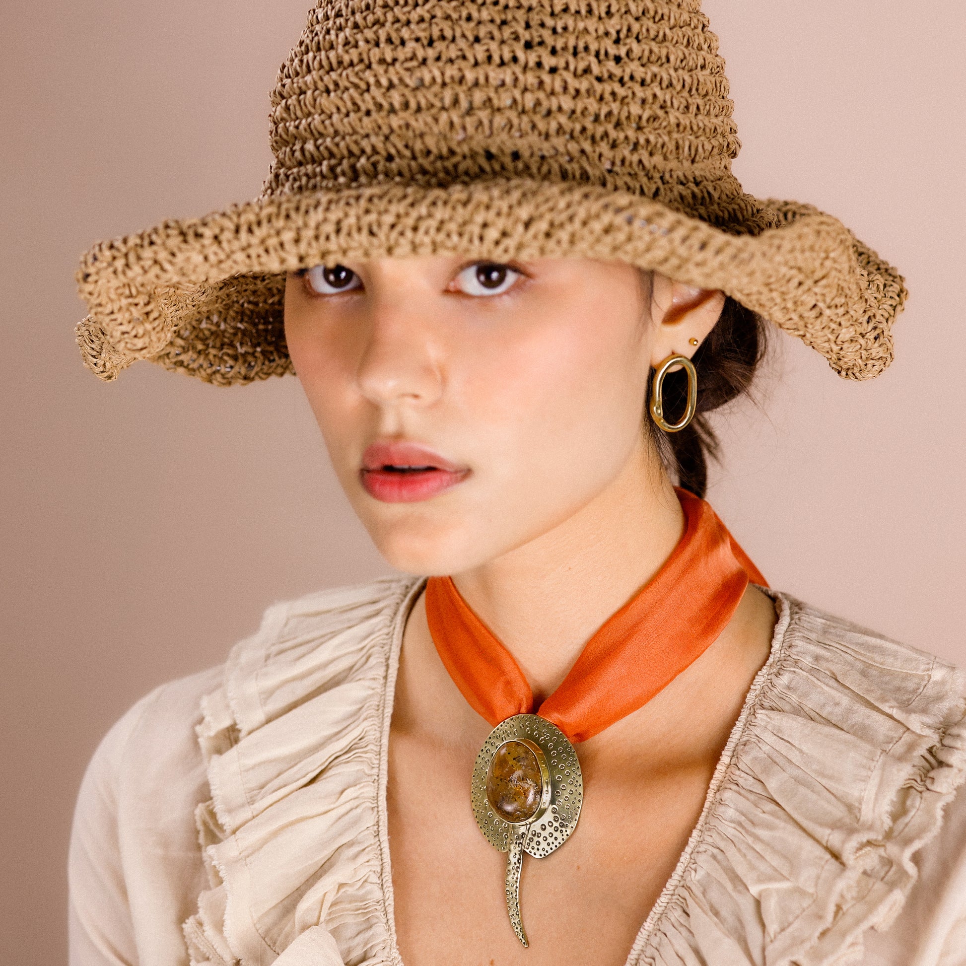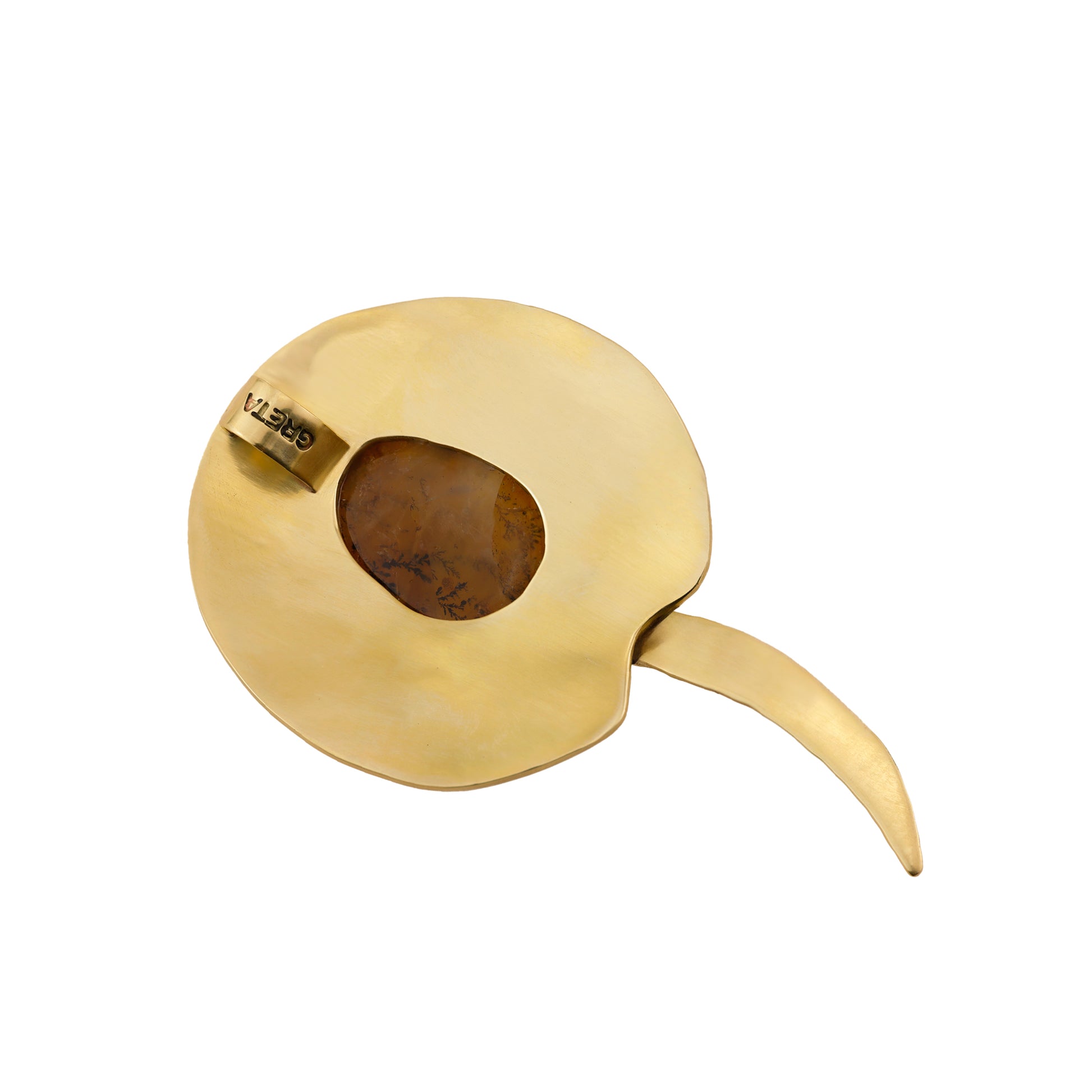 Pingente único de arraia de rio esculpida em latão com um quartzo rutilado no centro. Acabamento polido. Peça sem banho e sem verniz. Ele pode ser usado em lenços, choker fino e grosso ou no nosso mosquetão.