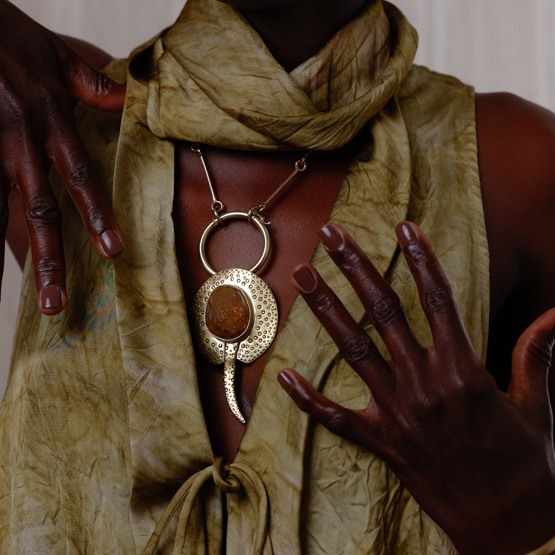 Pingente único de arraia de rio esculpida em latão com um quartzo rutilado no centro. Acabamento polido. Peça sem banho e sem verniz. Ele pode ser usado em lenços, choker fino e grosso ou no nosso mosquetão.