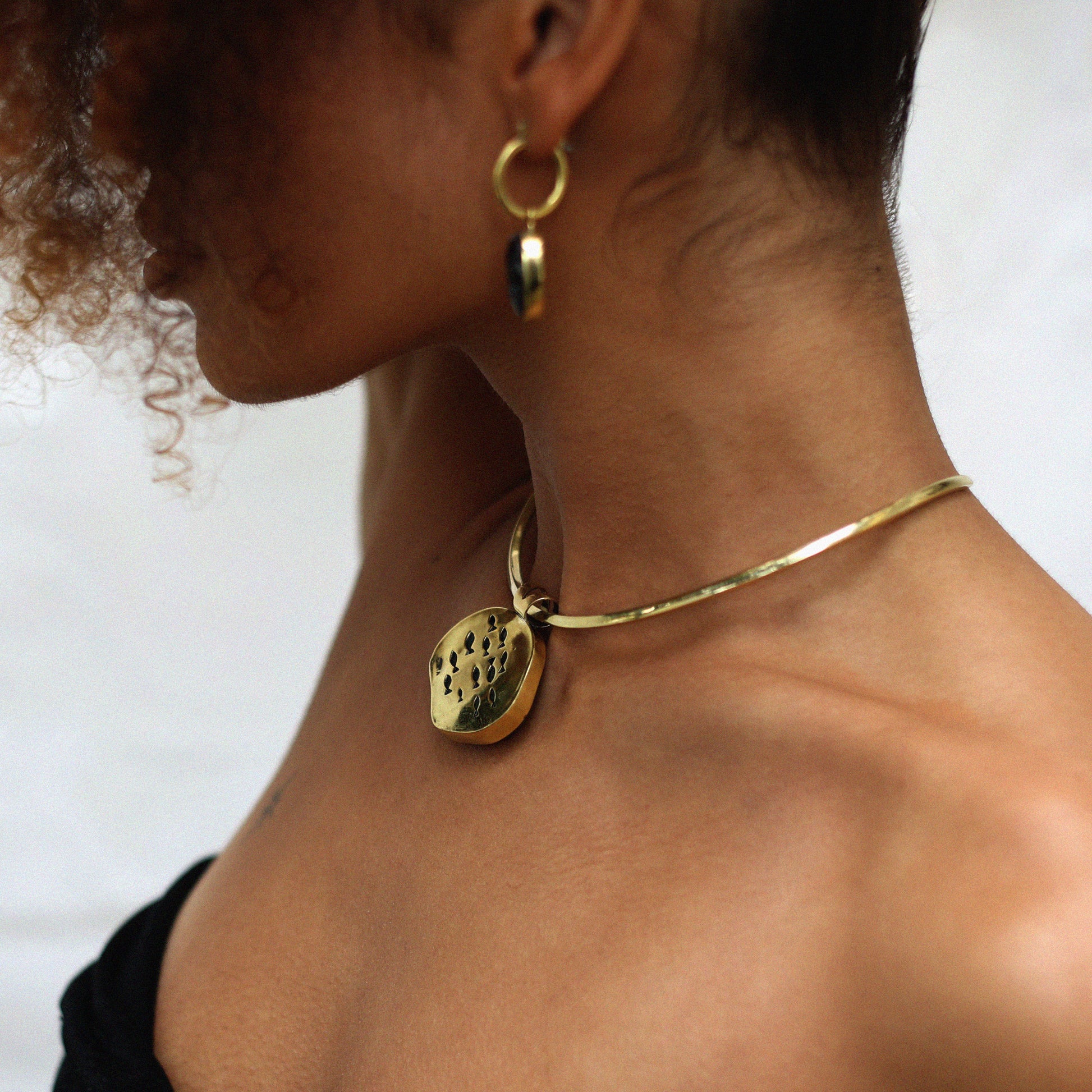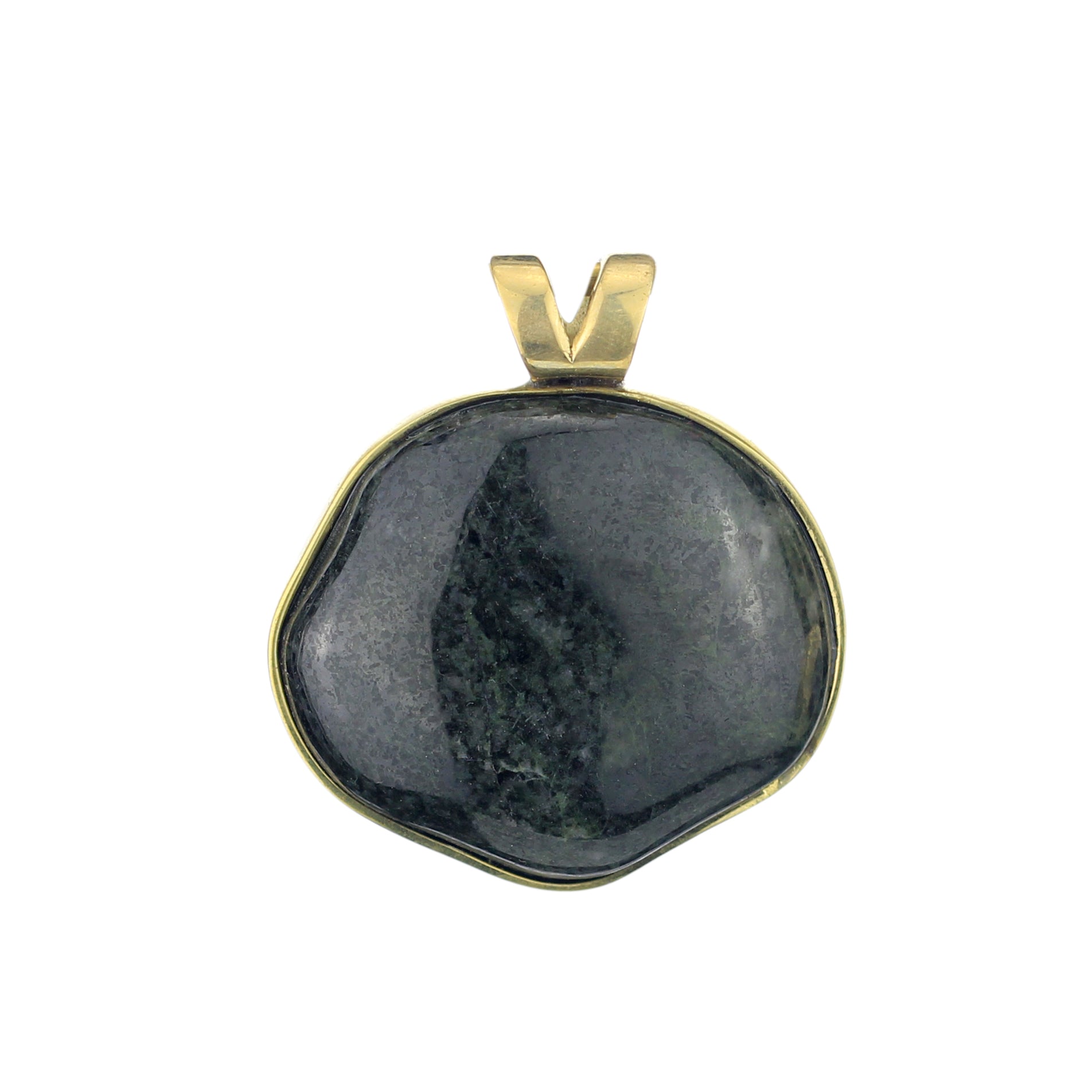 Pingente único em latão envolvendo uma jaspe crocodilo, com cardume serrado no verso do pingente. Acabamento polido. Peça sem banho e sem verniz. Ele pode ser usado dos dois lados, em lenços, choker fino e grosso ou no nosso mosquetão.