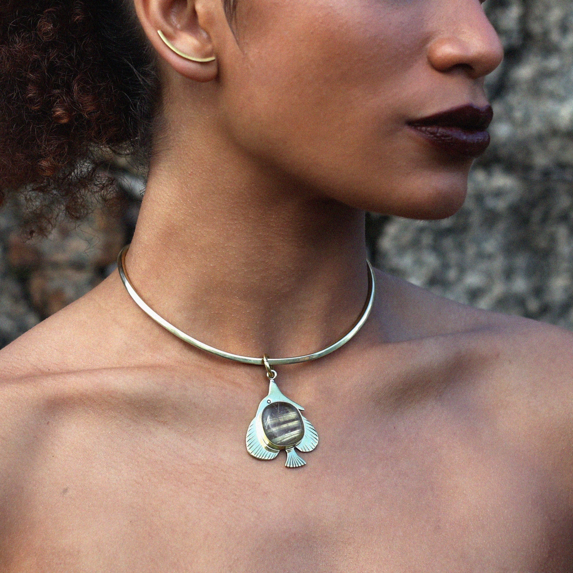 Pingente único de peixe esculpido em latão com pedra quartzo rutilado no cetro. Acabamento polido. Peça sem banho e sem verniz. Ele pode ser usado em lenços, choker fino e grosso ou no nosso mosquetão.