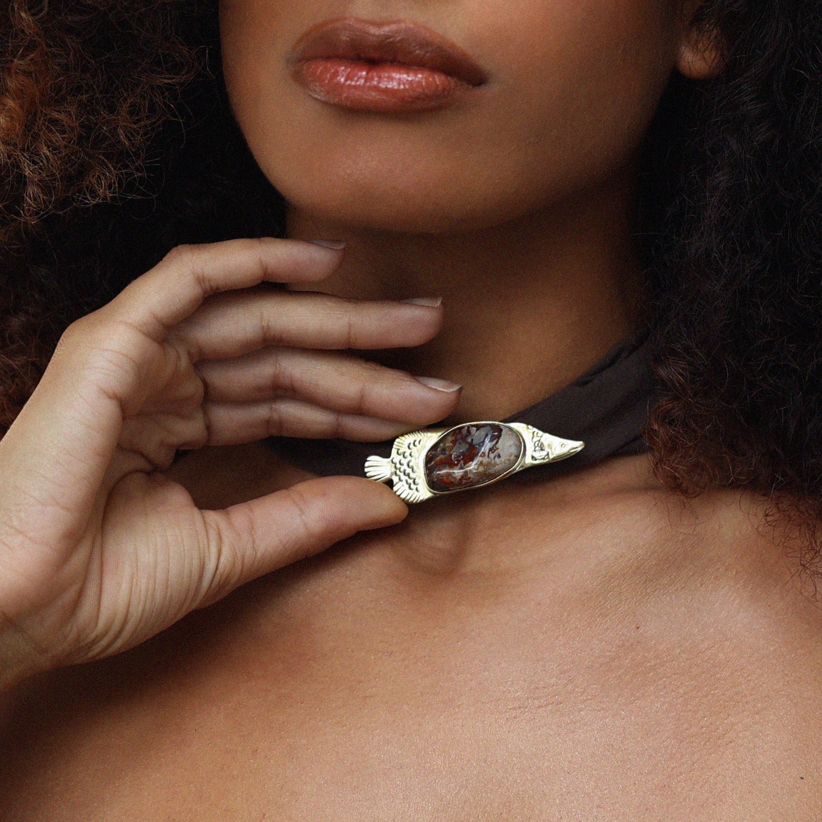 Pingente único de Pirarucu esculpido em latão com pedra Jaspe Olho de Pássaro no cetro. Acabamento polido. Peça sem banho e sem verniz. Ele pode ser usado em lenços, choker fino e grosso ou no nosso mosquetão.