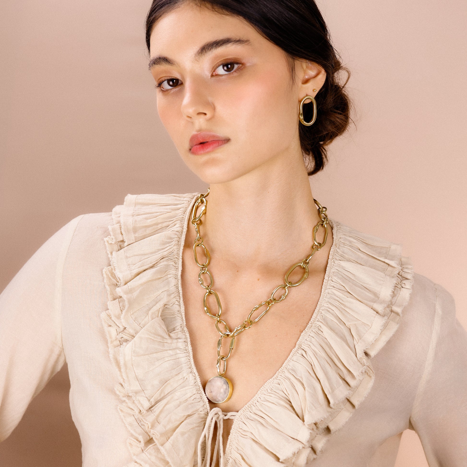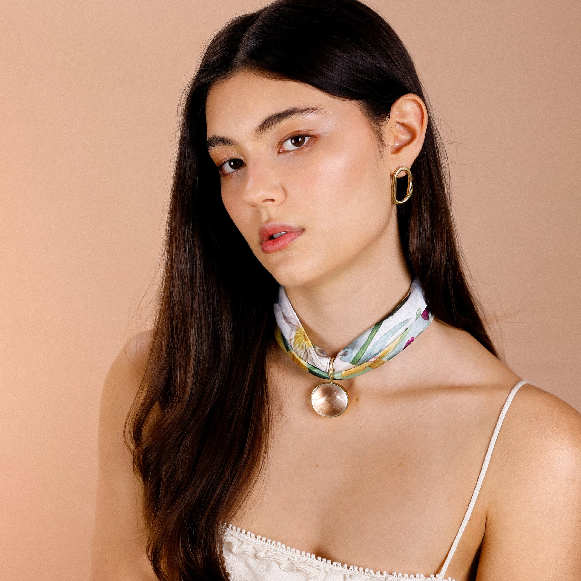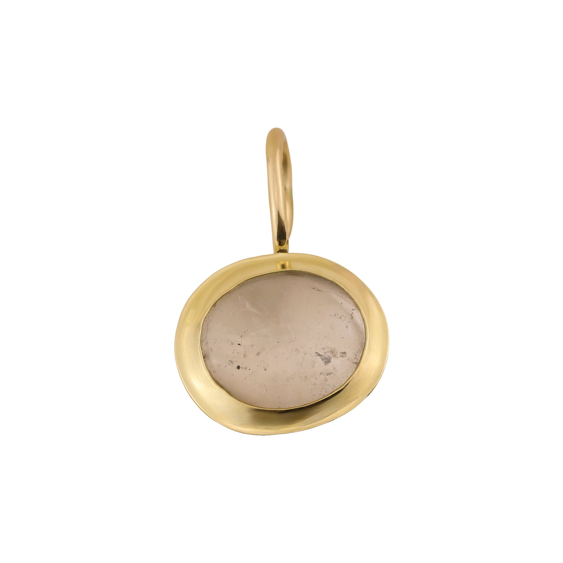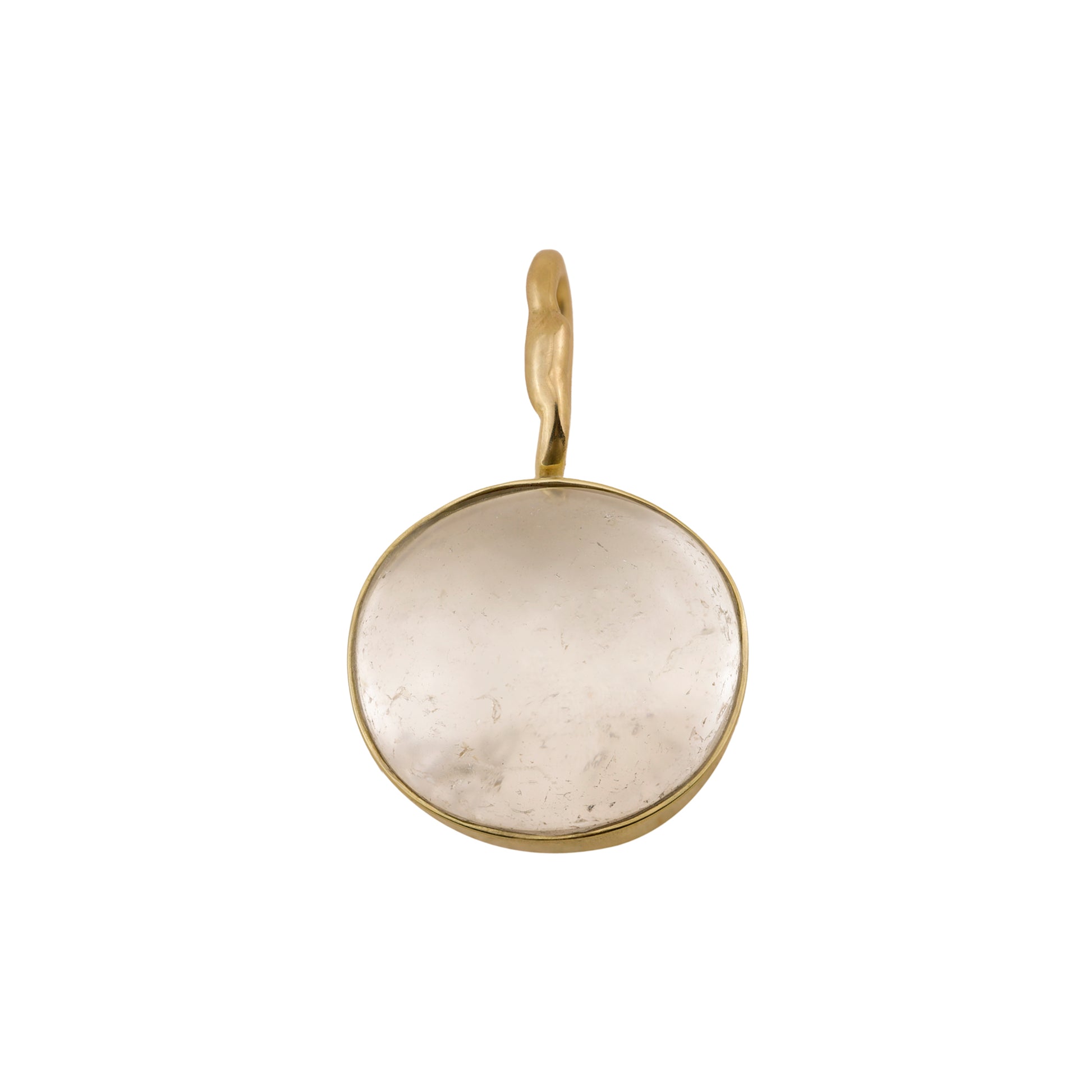 Pingente único em latão envolvendo um quartzo claro, passante em argola com elo derretido. Acabamento polido. Peça sem banho e sem verniz. Ele pode ser usado em lenços, choker fino e grosso ou no nosso mosquetão.