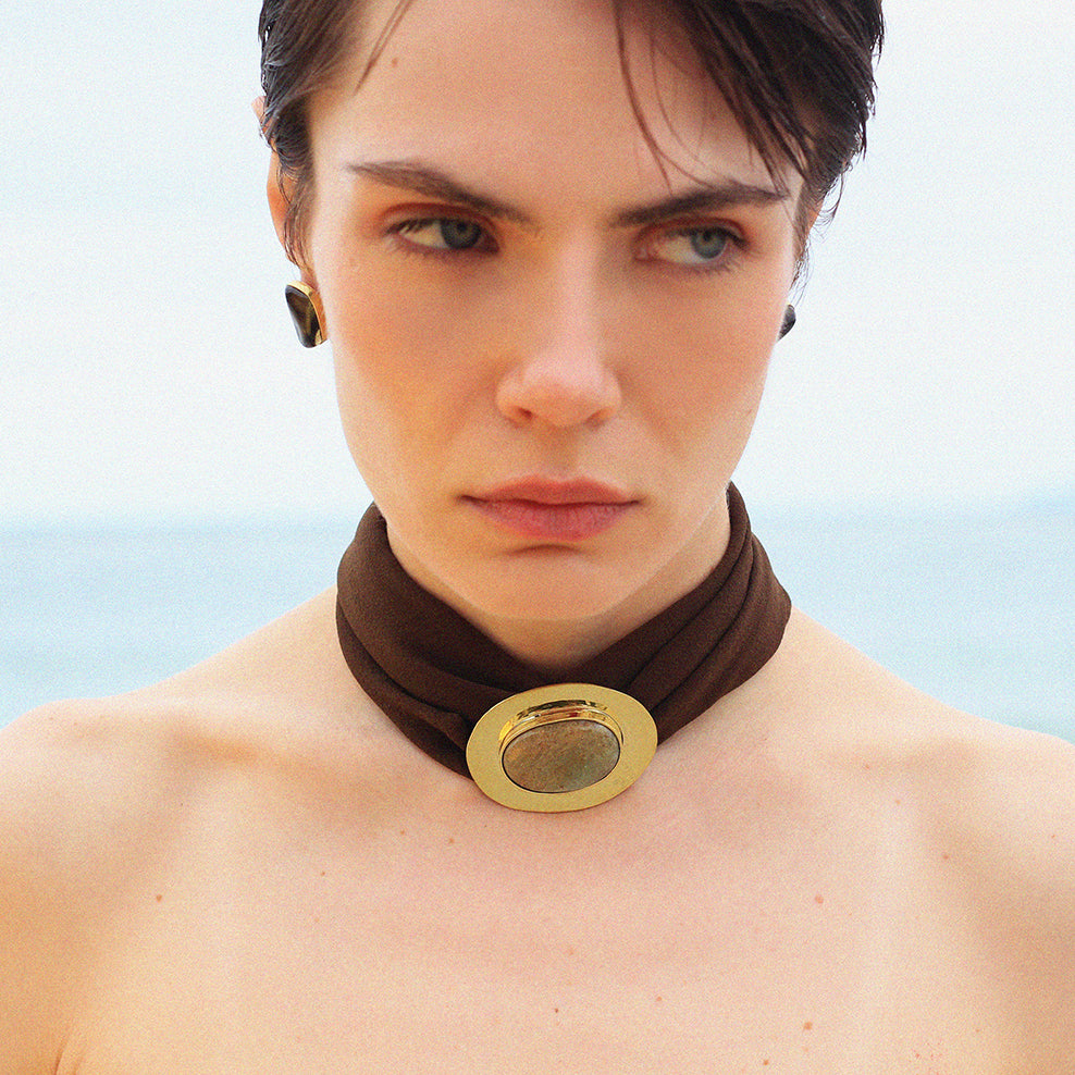 Pingente único em latão envolvendo uma Aventurina, com acabamento polido. Ele pode ser usado em lenços, choker fino e grosso ou no nosso mosquetão.