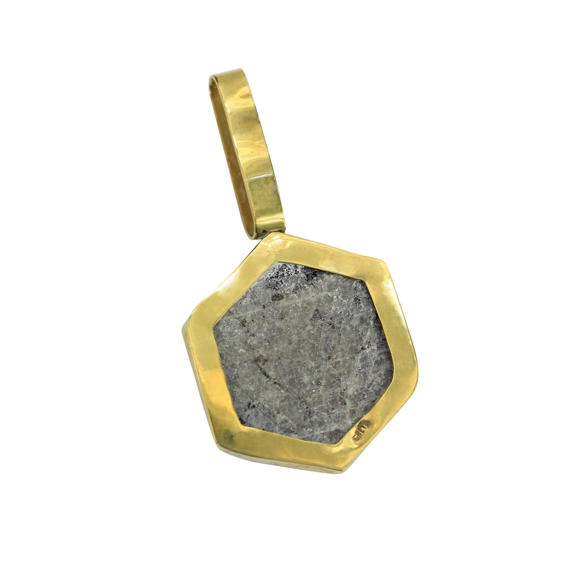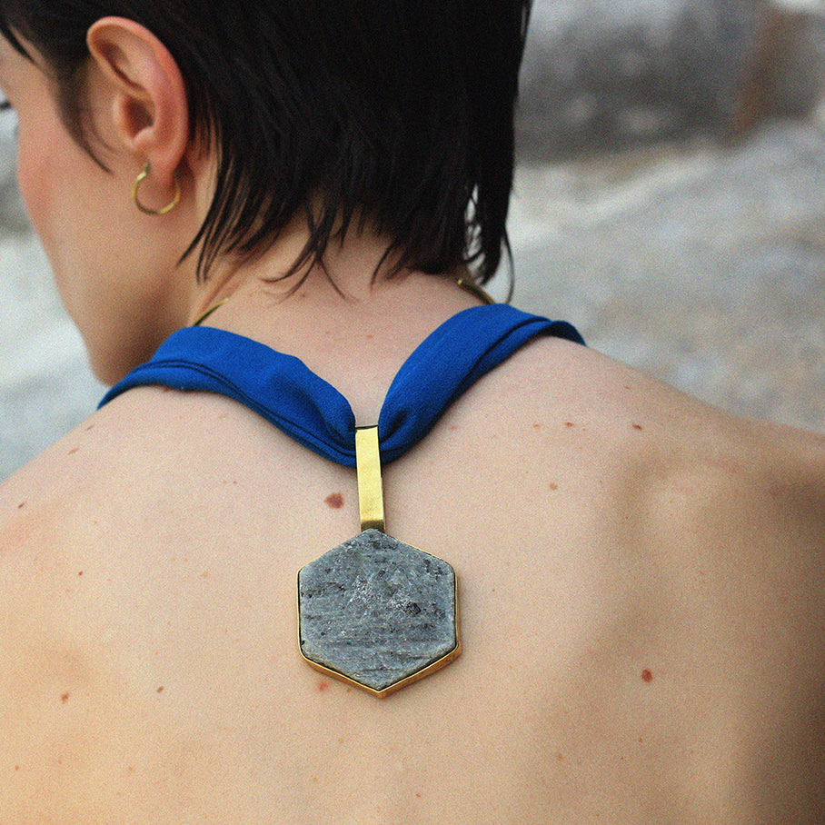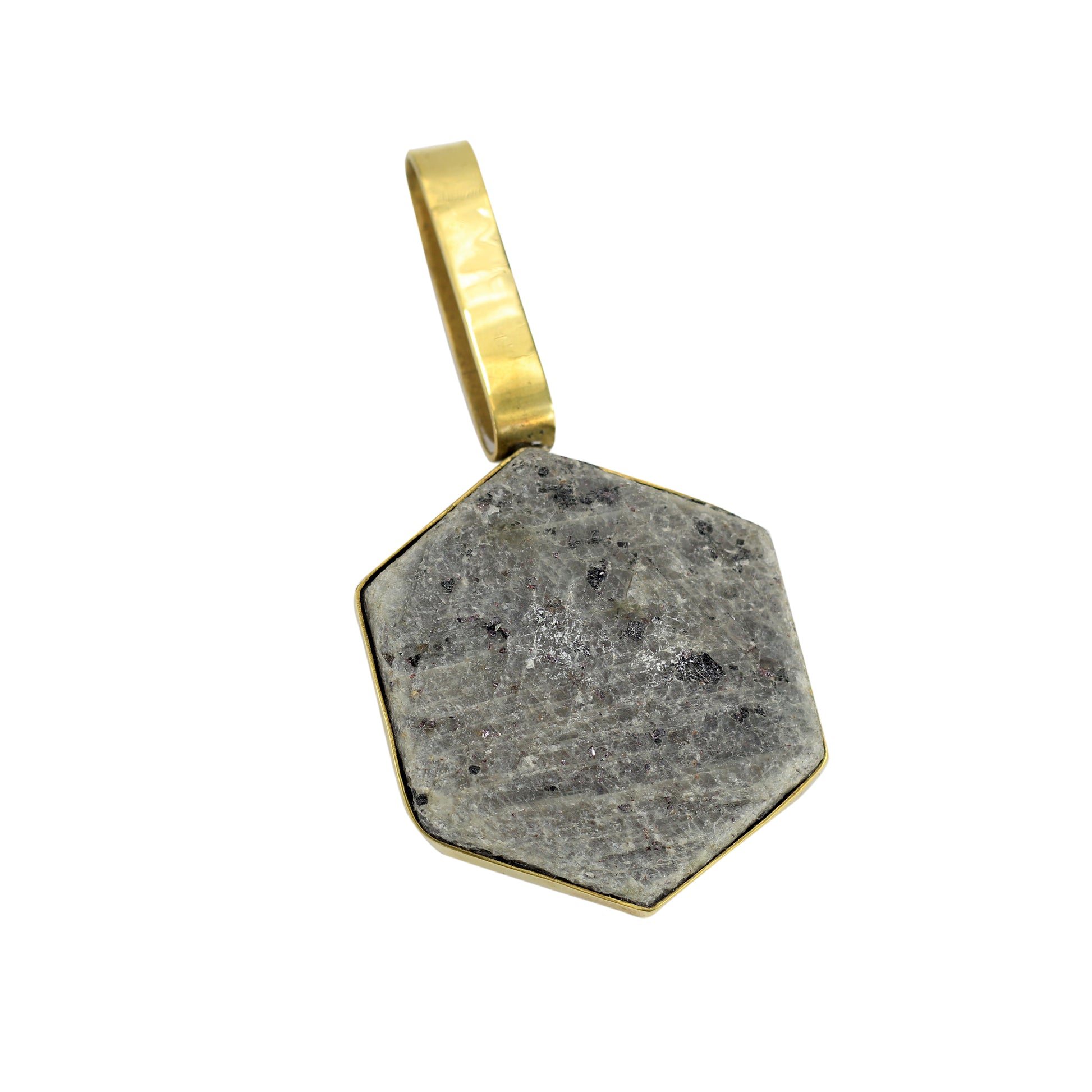 Pingente único em latão envolvendo uma matriz de pedra Rubi natural, com acabamento polido. Ele pode ser usado em lenços, choker fino e grosso ou no nosso mosquetão.