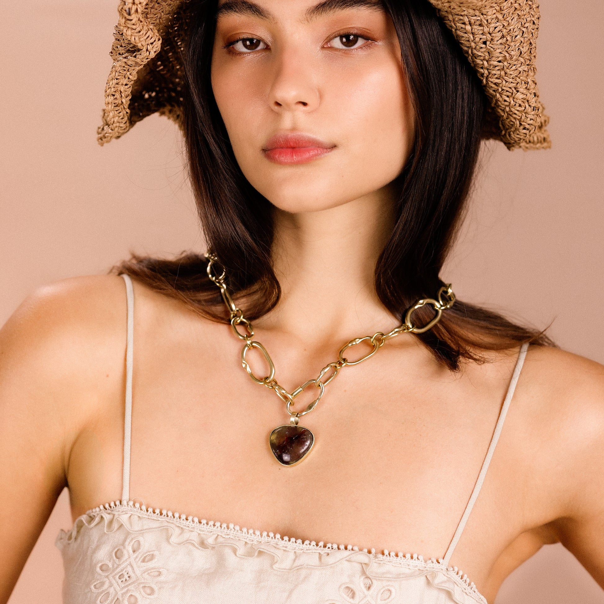 Pingente de latão com quartzo. Pode ser usado em choker, lenço e nossos colares mosquetão.